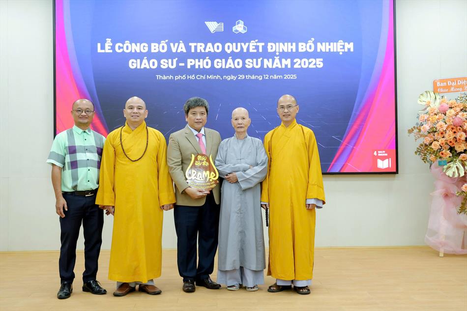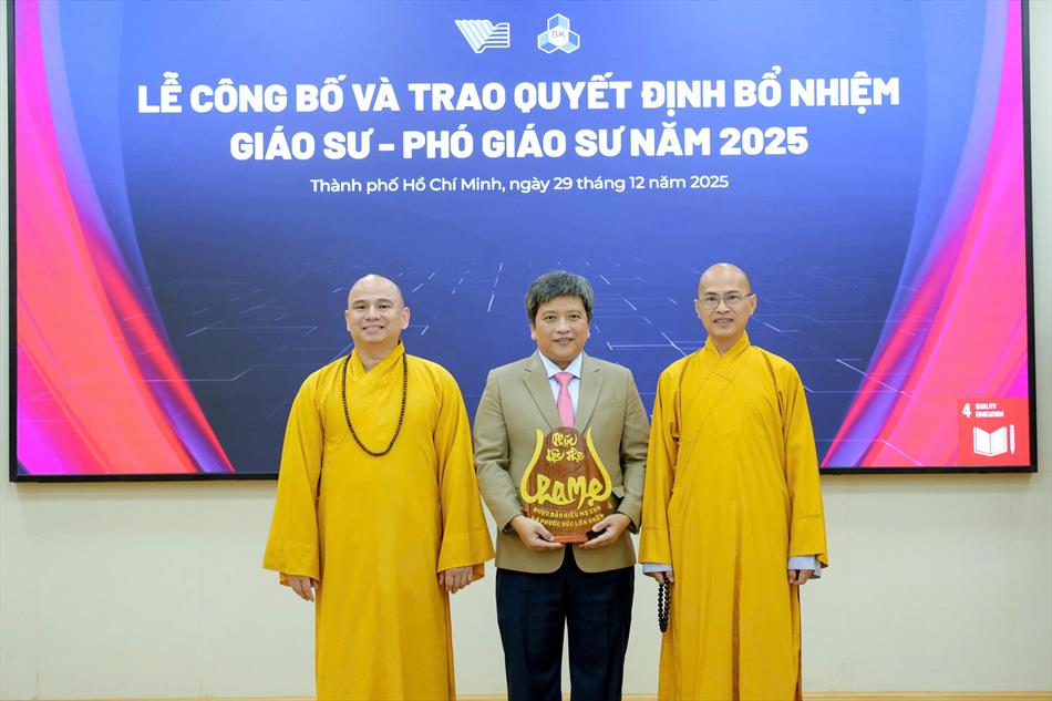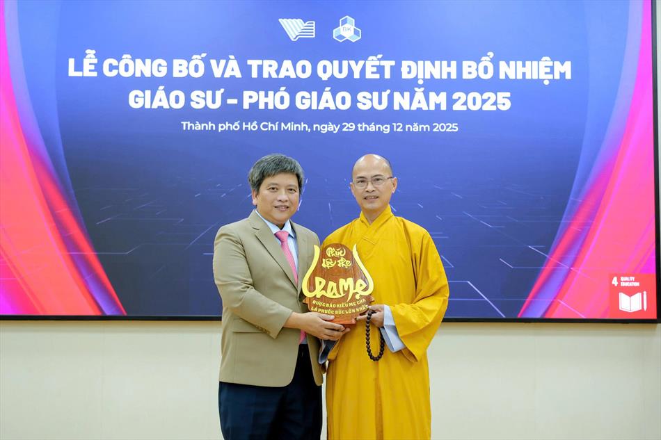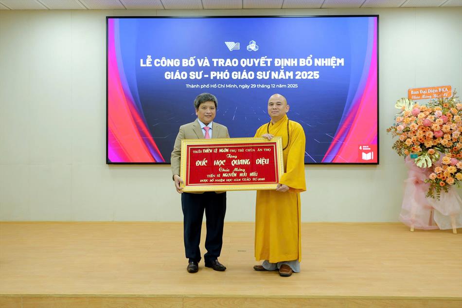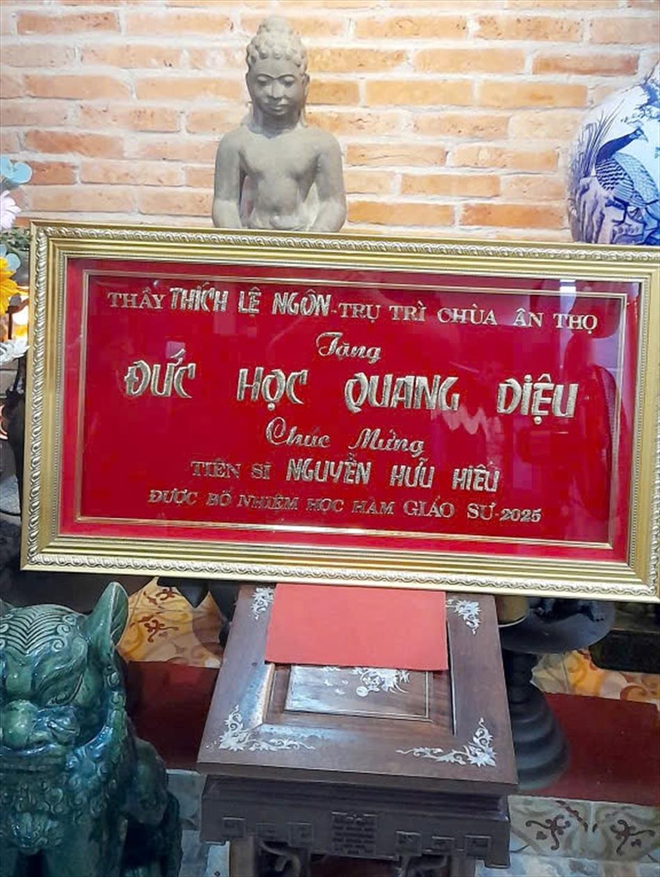 Trong niềm hoan hỷ, hai thầy đã trao tặng những phần quà chúc mừng đầy ý nghĩa: tác phẩm thư pháp khắc gỗ thủ công do Thượng tọa Thích Lệ Trí thực hiện và khánh vàng bốn chữ “Đức Học Quang Diệu” do Đại đức Thích Lệ Ngôn kính tặng. Đáng quý hơn, trong các sự kiện trọng đại của Nguyễn Hữu Hiếu như lễ thành hôn, lễ bổ nhiệm Phó Giáo sư và nay là Giáo sư, hai thầy đều hiện diện, thể hiện sự quan tâm bền bỉ và nghĩa tình sâu đậm. Nguyễn Hữu Hiếu luôn trân trọng và ghi nhớ ân tình ấy như một nguồn động viên lớn trên hành trình học thuật và cuộc sống. Còn có sự hiện diện của gia đình và thân hữu trong ngày trọng đại này.