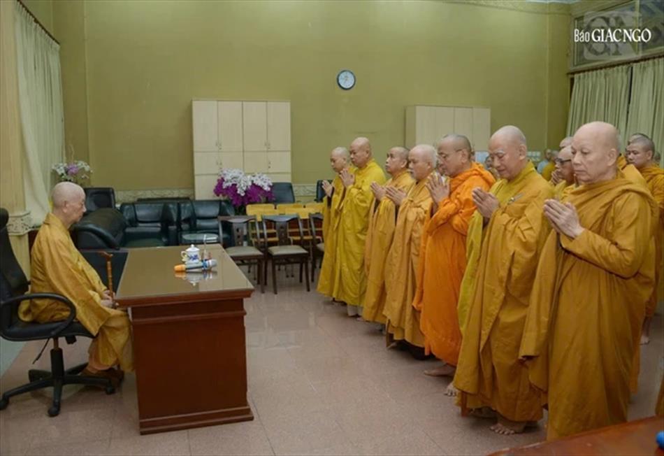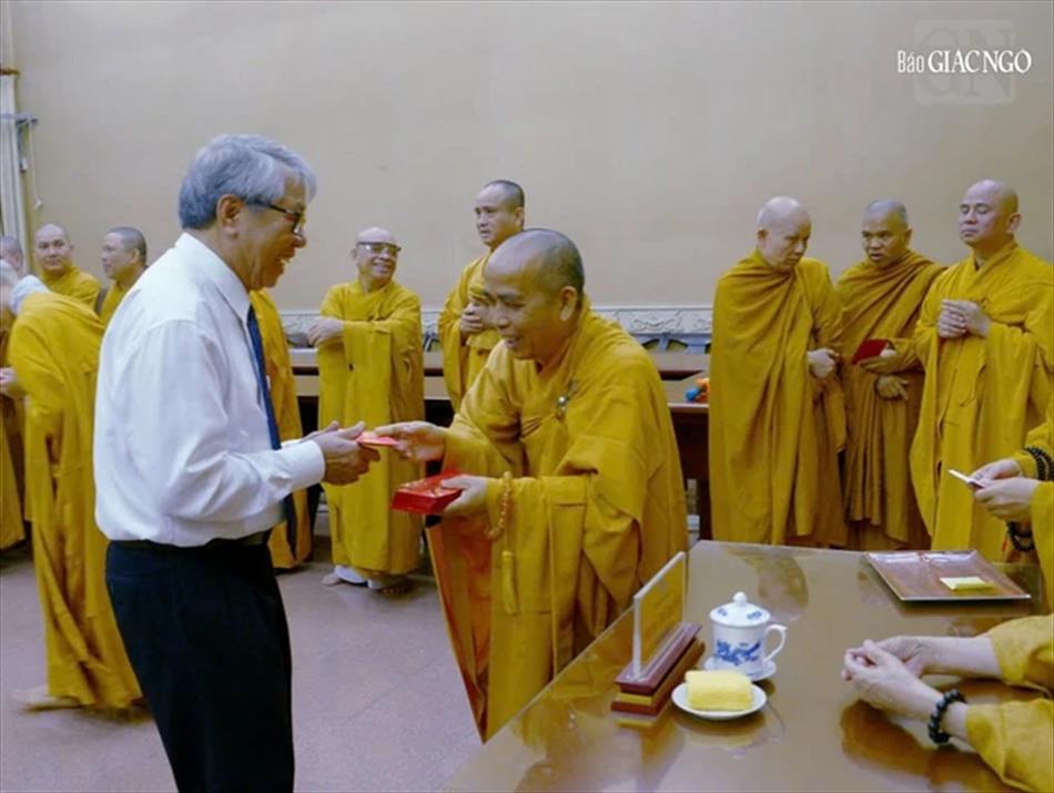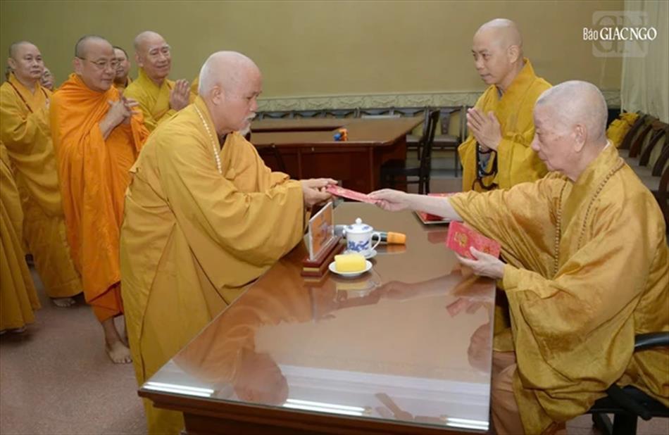Trước đó, thay mặt Hội đồng Điều hành Học viện, Thượng tọa Thích Giác Dũng đã dâng lời khánh tuế đầu năm lên Đại lão Hòa thượng Viện trưởng.