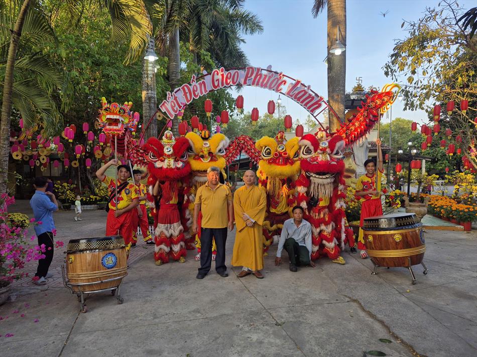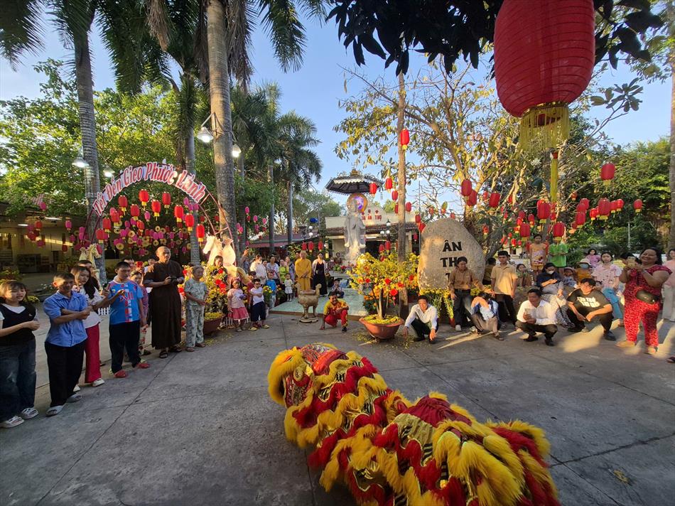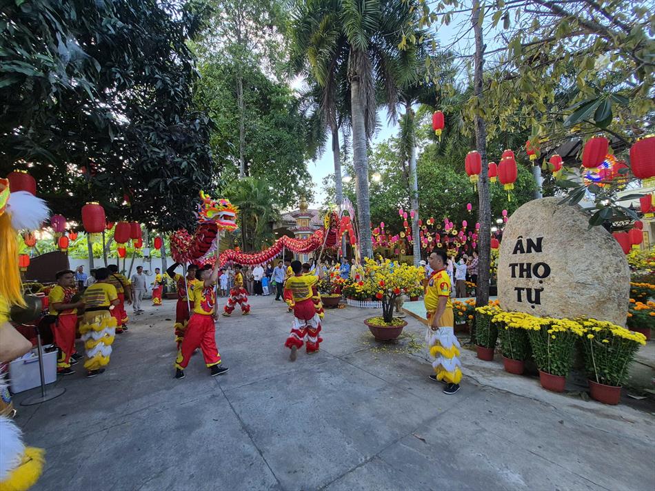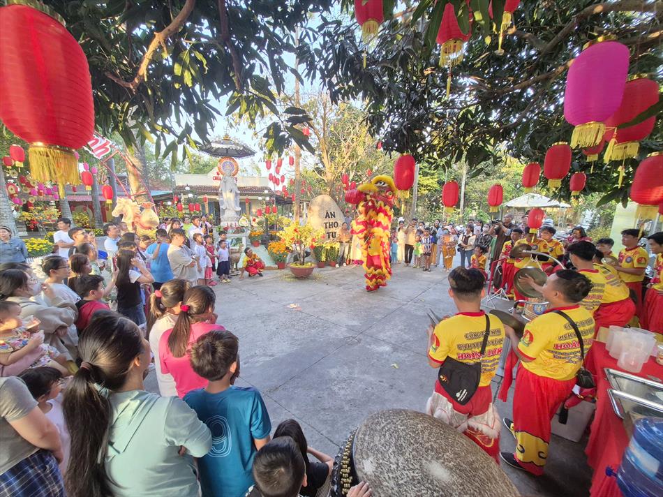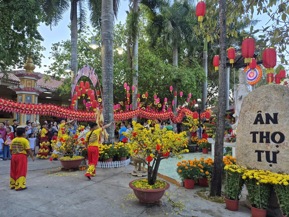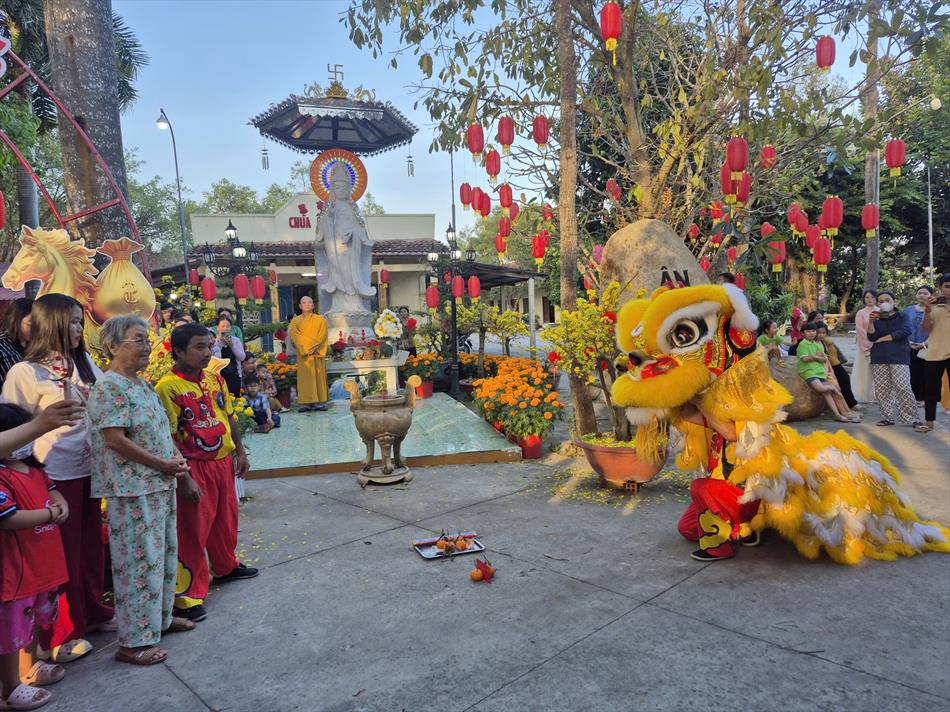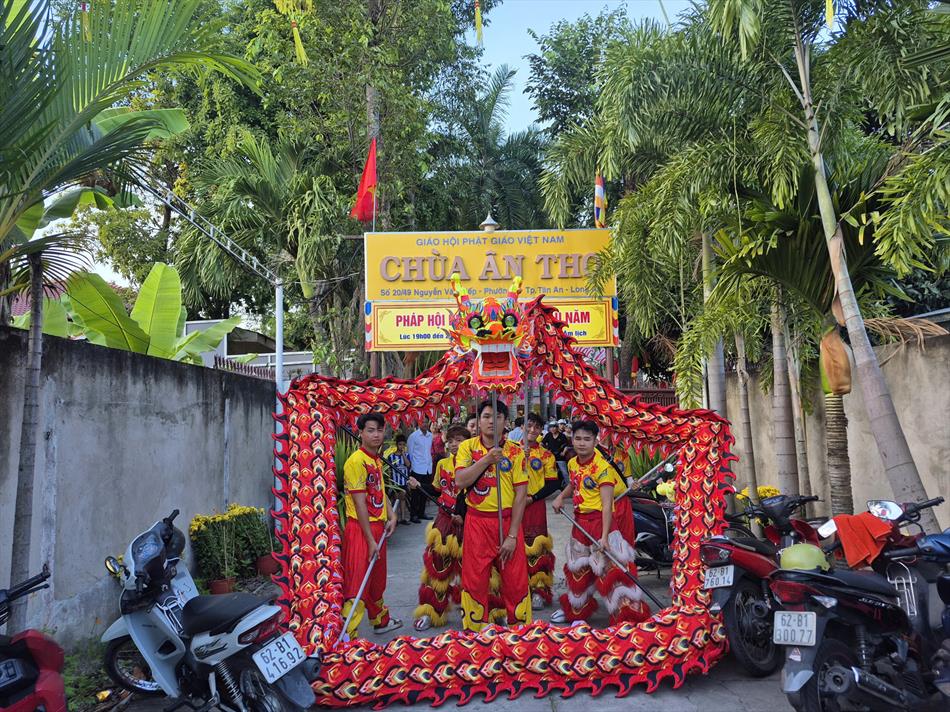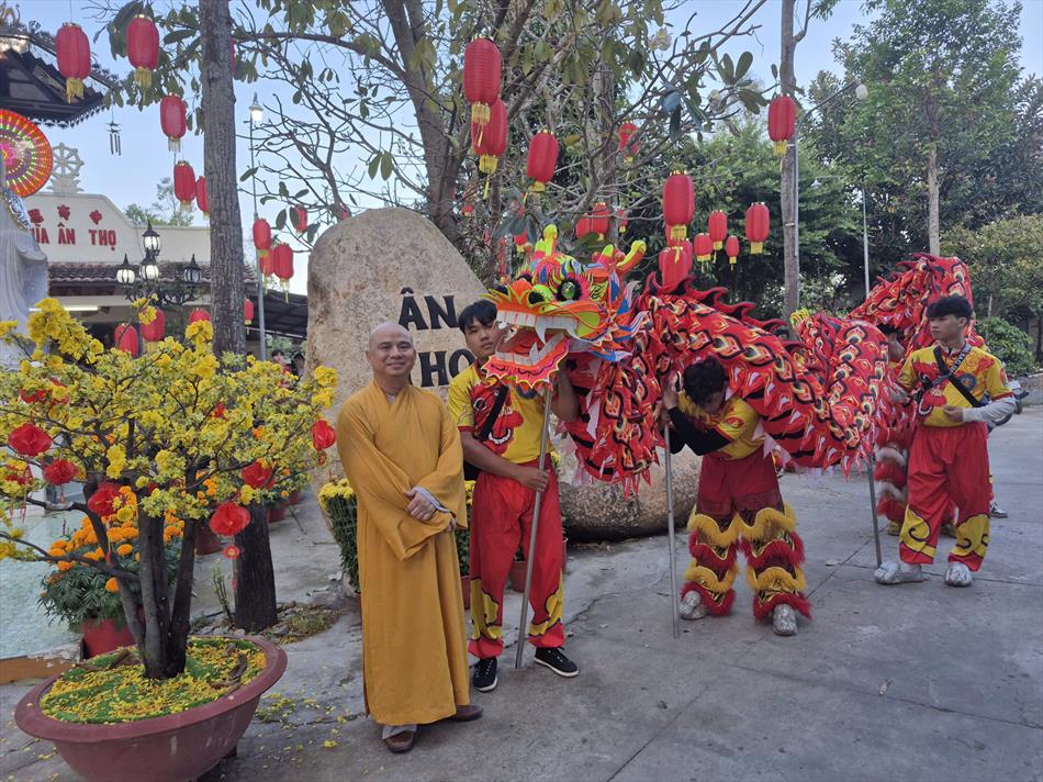 Vào buổi chiều, mùng 4 Tết, chùa Ân Thọ hân hoan đón đoàn lân sư rồng Nhà Văn Hoá Thiếu Nhi Long An đến biểu diễn cúng Tam Bảo, cúng Bà và chúc mừng năm mới.