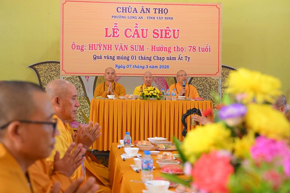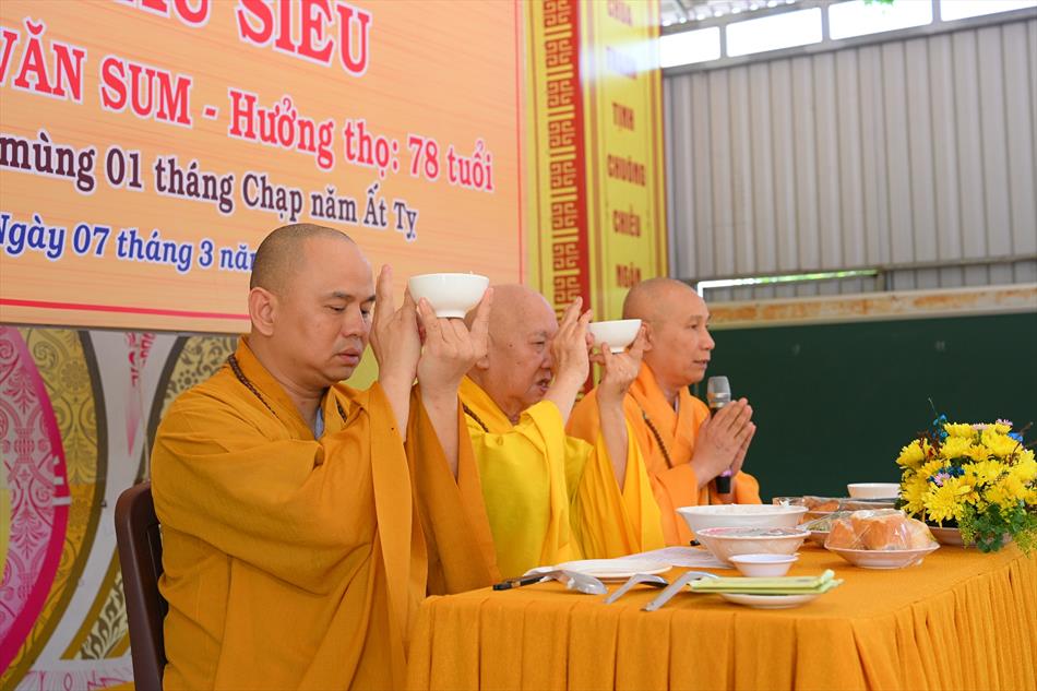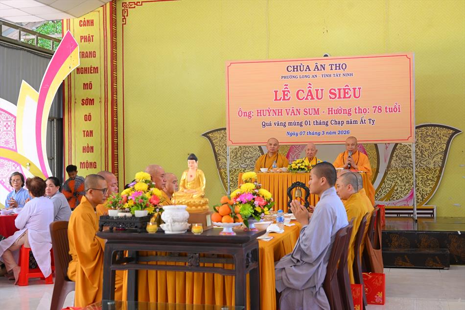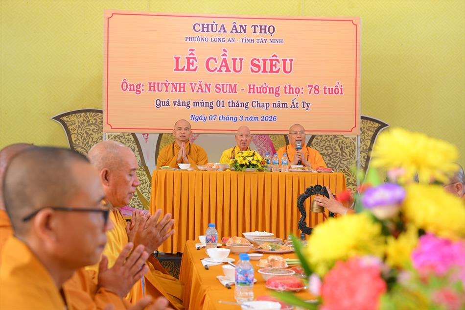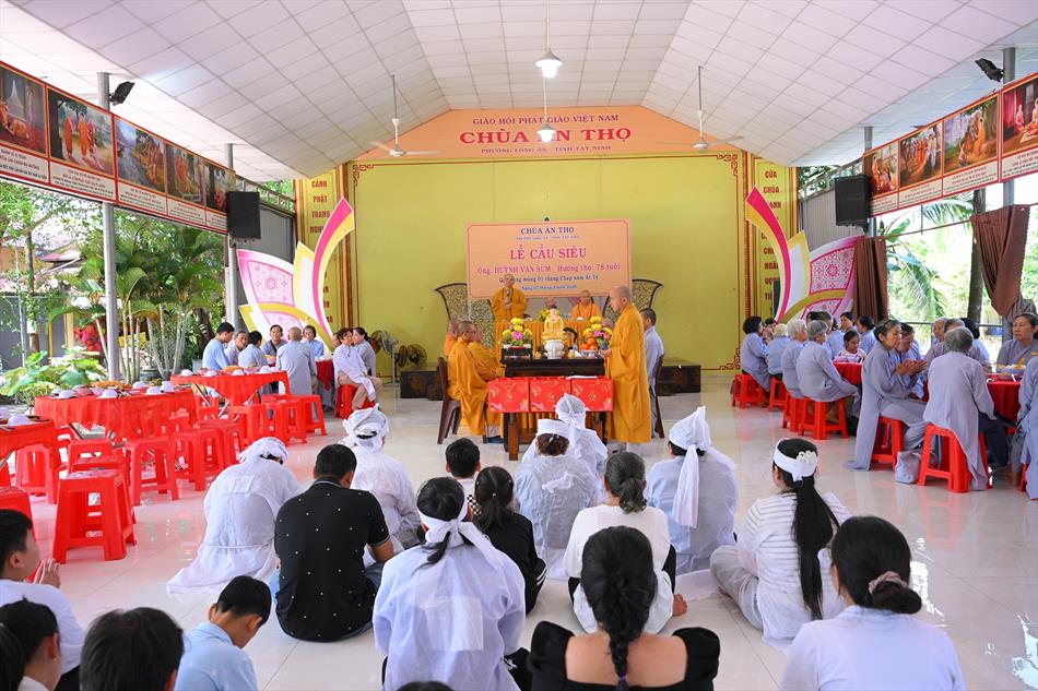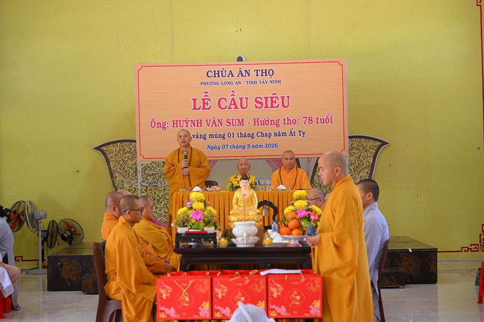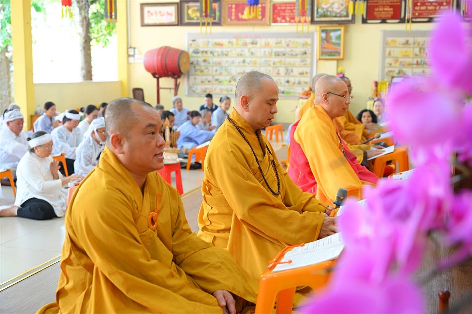 Trong không khí trang nghiêm nơi chánh điện, chư Tôn đức đã cử hành thời kinh cầu siêu với lời kinh nhiệm mầu, tiếng tụng trầm hùng, nhất tâm hồi hướng công đức cho hương linh ông Huỳnh Văn Sum sớm được siêu sinh tịnh cảnh. Thời kinh do Thượng tọa Trụ trì và Đại đức Huệ Phát chủ trì xướng tụng.