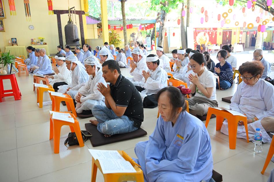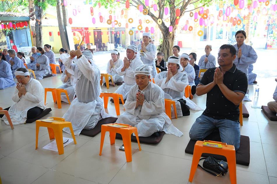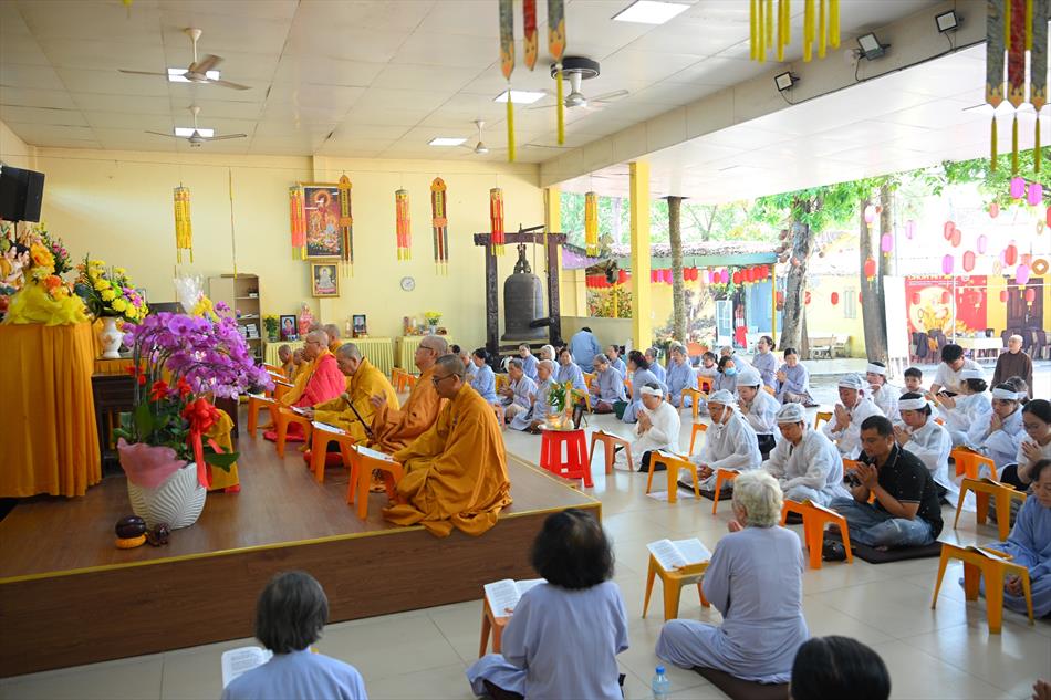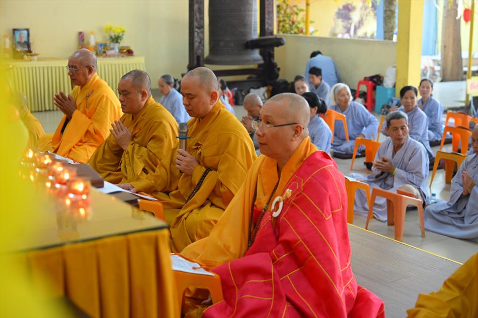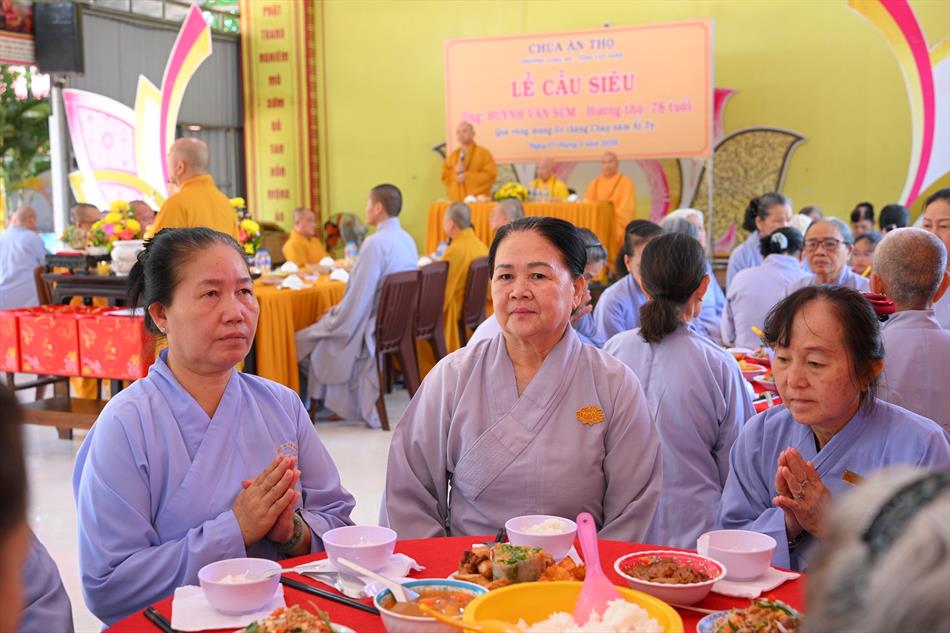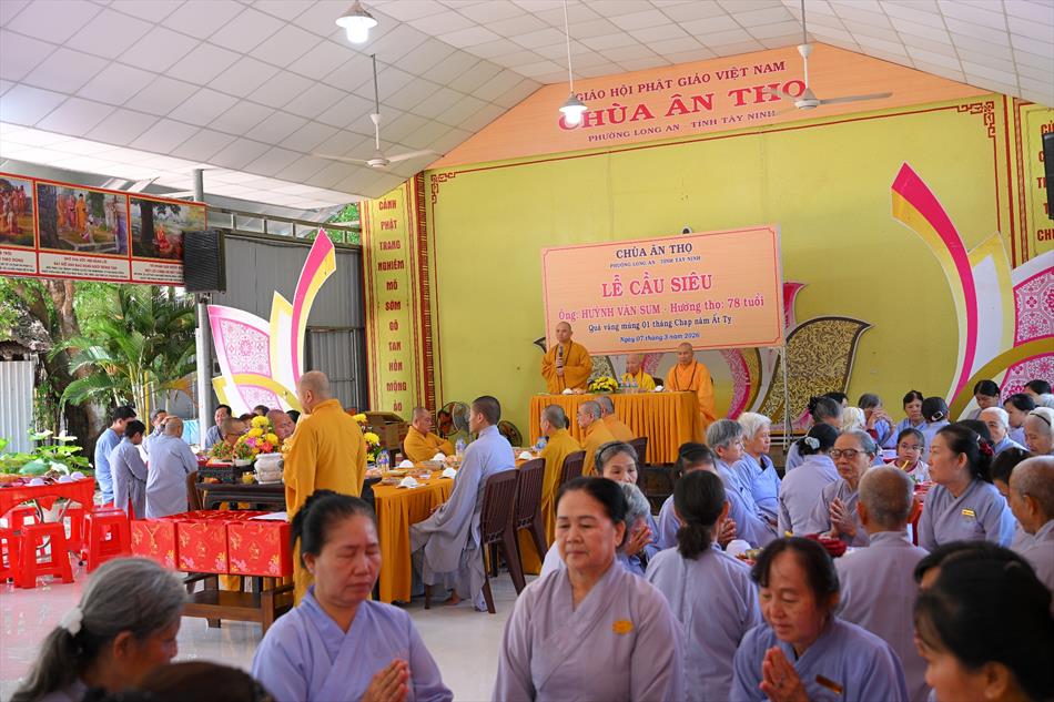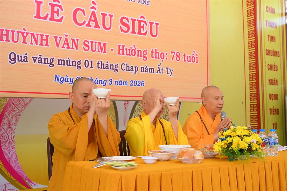 Trong không khí trang nghiêm nơi chánh điện, chư Tôn đức đã cử hành thời kinh cầu siêu với lời kinh nhiệm mầu, tiếng tụng trầm hùng, nhất tâm hồi hướng công đức cho hương linh ông Huỳnh Văn Sum sớm được siêu sinh tịnh cảnh. Thời kinh do Thượng tọa Trụ trì và Đại đức Huệ Phát chủ trì xướng tụng.