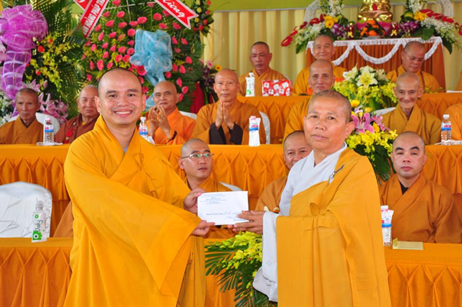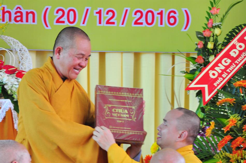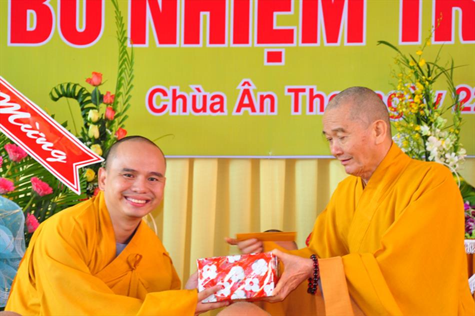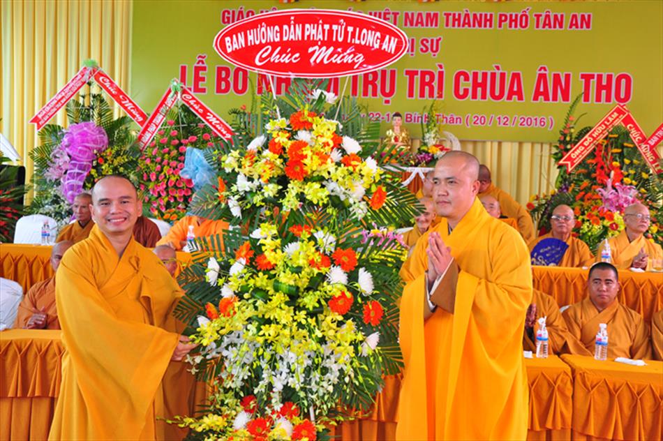 Sau đó, vị tân trụ trì đã tiếp nhận những lẵng hoa và phần qua cao quý được trao tặng chức mừng. Cuối cùng, tân trụ trì đã tỏ bày lời cảm tạ đến sự thân lâm chứng minh của nhị vị Hoà thượng Uỷ viên Thường trực HĐTS, Ban chứng minh, Ban thường trực BTS, BTS GHPGVN tỉnh Long An và các BTS GHPGVN các huyện, thị xã, thành phố và chư tôn đức hiện diện. Đặc biệt, là BTS GHPGVN Tp Tân An đã chỉ đạo để tổ chức bổ lễ được thành tựu. Tri ân lời giao phó của Thượng toạ viện chủ. Cung kính tiếp nhận lời đạo từ của Hoà thượng Trưởng ban BTS GHPGVN tỉnh Long An. Tri ân quý đại biểu chính quyền và ghi nhận lời phát biểu quý báu của ông Chủ tịch UBND Tp Tân An. Tri ân quý Phật tử đã tham dự và ủng hộ tịnh tài và nhân lực để tổ chức buổi lễ.