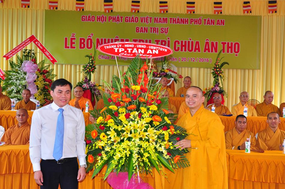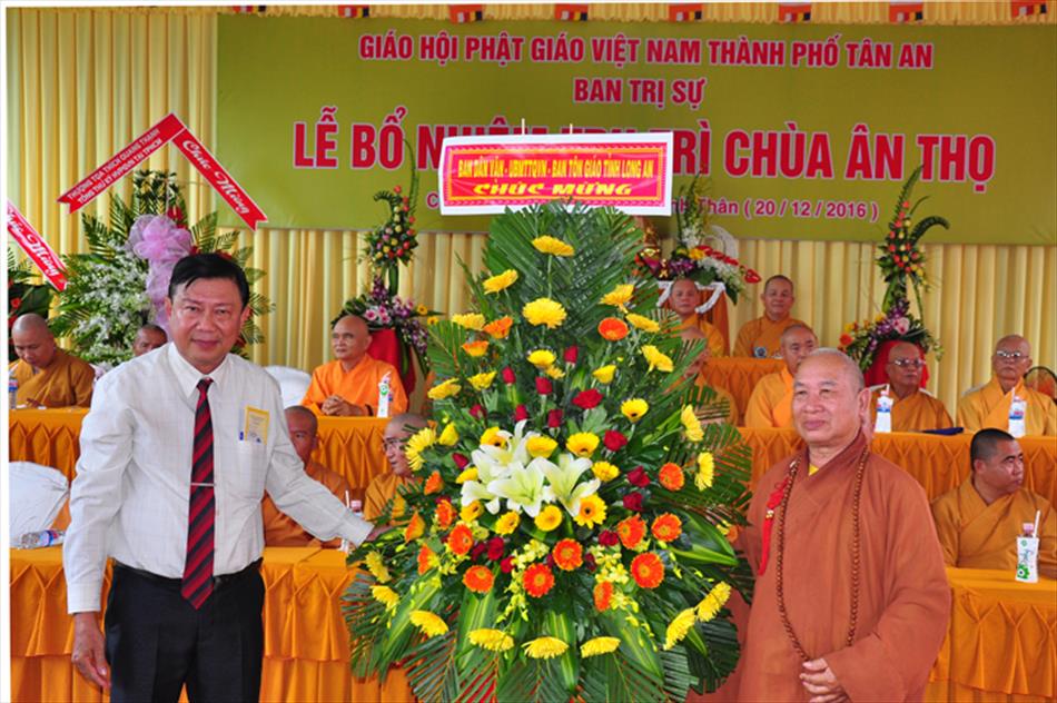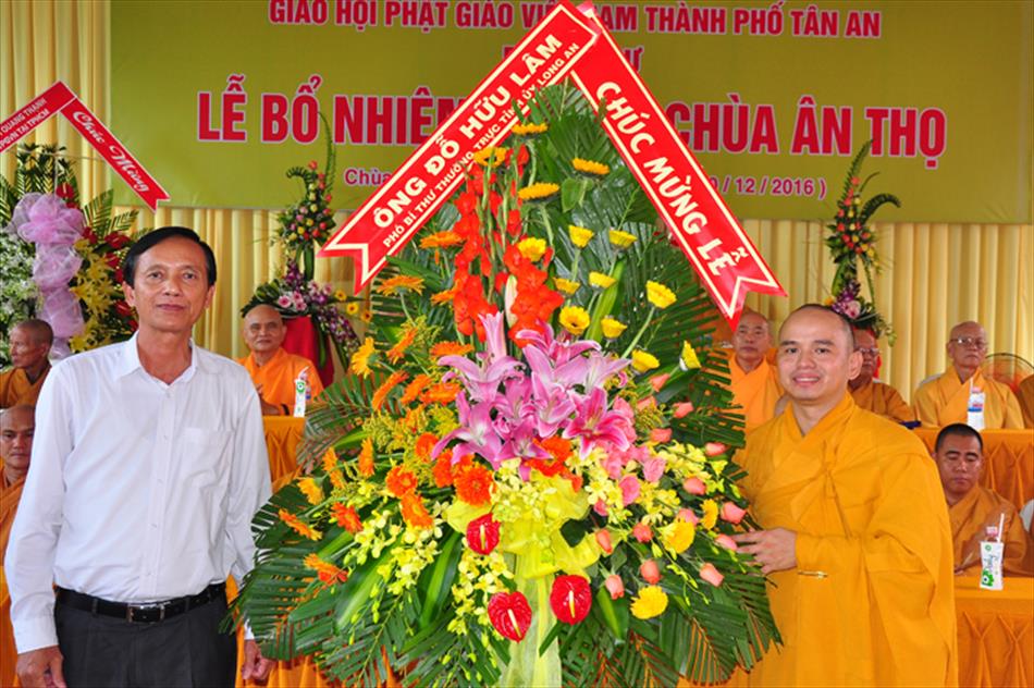 Ông Lê Công Đỉnh – Đại biểu Quốc hội khoá XIII và IX, Tỉnh uỷ viên, Chủ tịch UBND Tp Tân An phát biểu trong buổi lễ. Ông đã ghi nhận và đánh giá cao sự đóng góp thời gian qua các tín đồ tôn giáo trên trên bàn, trong đó có Phật giáo và chùa Ân Thọ đã thực hiện tốt các chủ trương, chính sách của Đảng, pháp luật nhà nước, sống tốt đời đẹp đẹp, tham gia các chỉ tiêu phát triển kinh tế – xã hội, các hoạt động từ thiện xã hội. Ông đã thông tri về chính sách nhất quán của Nhà nước là luôn tôn trọng quyền tự do tín ngưỡng, tôn giáo, đồng thời tạo điều kiện để các tôn giáo, trong đó có Phật giáo trong sự tu hành và góp sức vào việc tốt đời đẹp đạo.