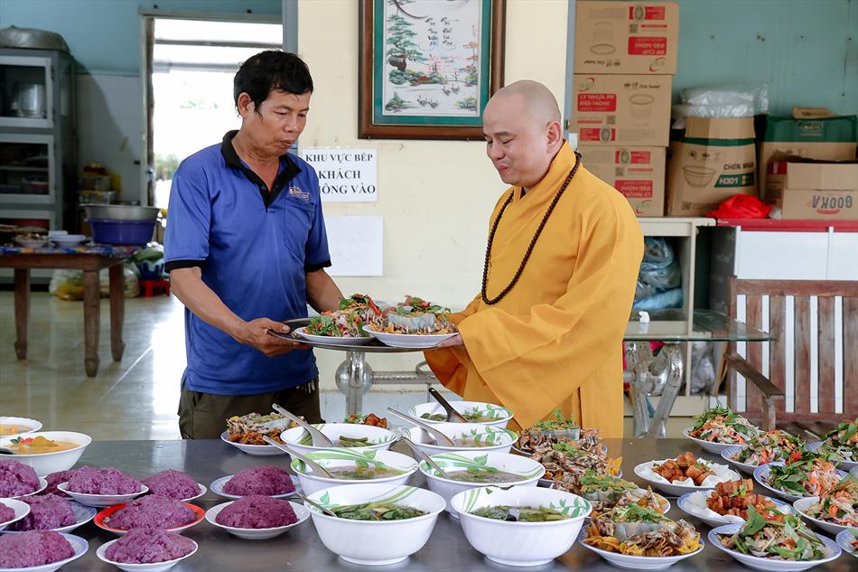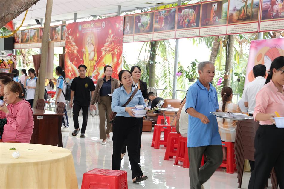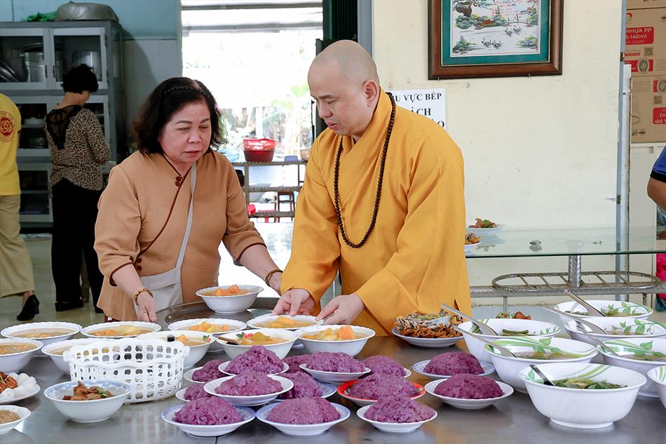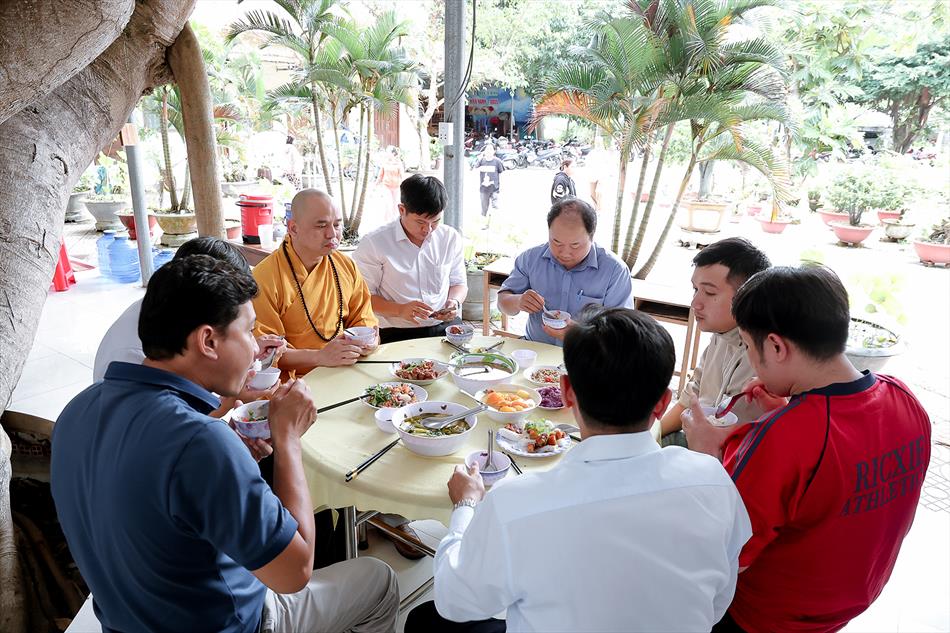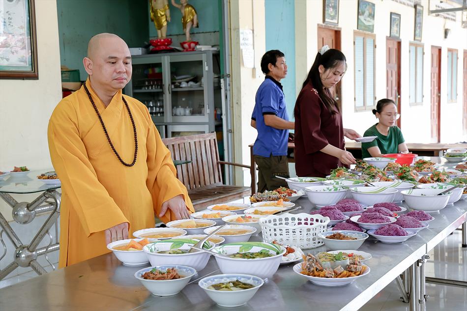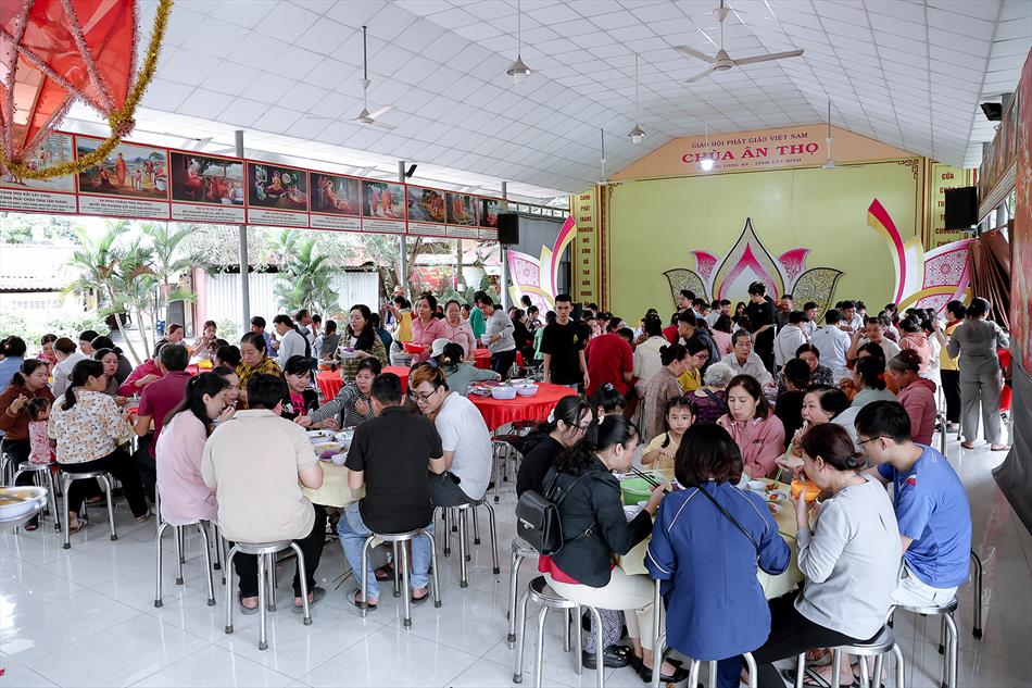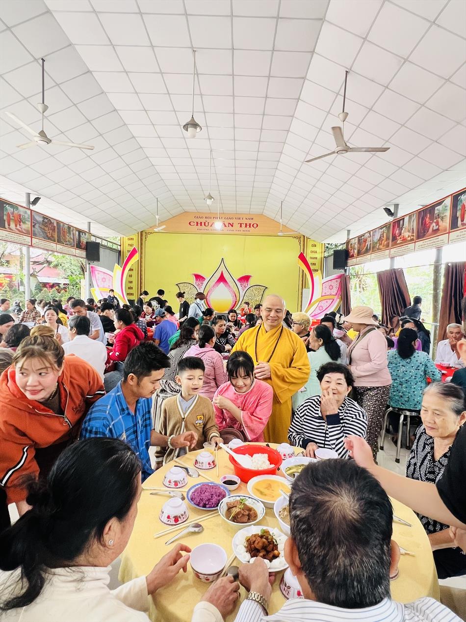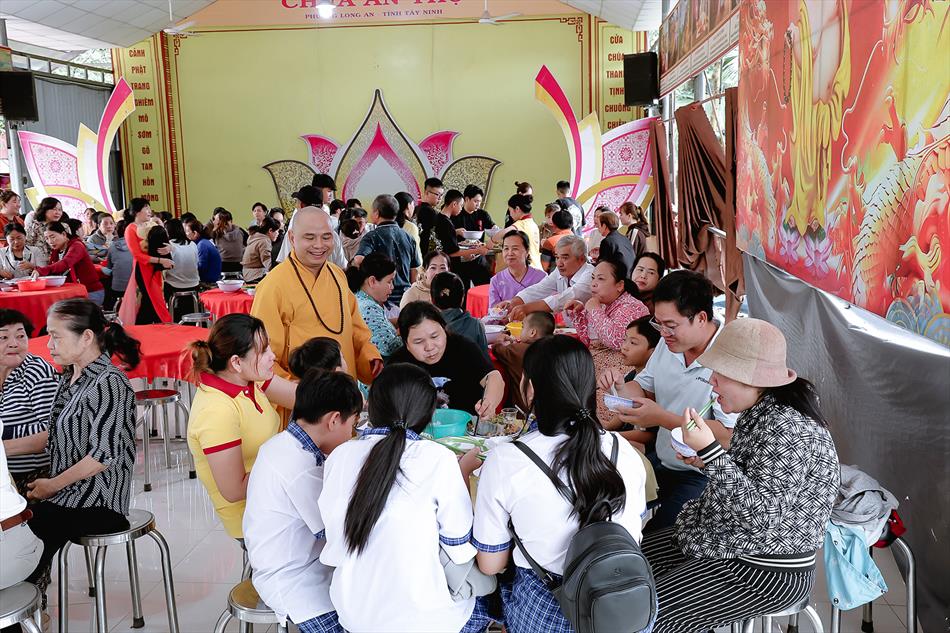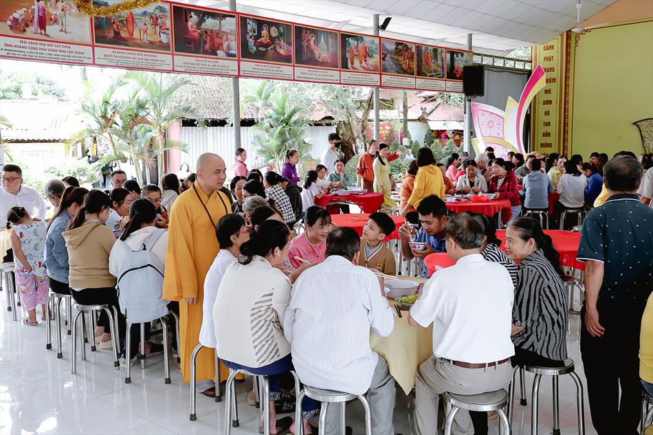 Sau lễ quy y và tụng kinh, chùa đón tiếp đông đảo Phật tử và khách thập phương đến dâng hương, lễ Phật. Như thường lệ vào các ngày rằm lớn, chùa chuẩn bị bữa cơm chay thân mật. Nhà bếp đã sắp xếp công việc liên tục suốt một tuần lễ, chuẩn bị các món chiên, xào, xỏ xiên…trữ đông để phục vụ hôm nay. Tổng cộng 150 mâm (mỗi mâm 10 người) được chiêu đãi trong buổi trưa. Lời khen của khách làm cho đại chúng quên đi mệt nhọc, xem đó như niềm vui cống hiến cho Tam Bảo và phục vụ khách thập phương.