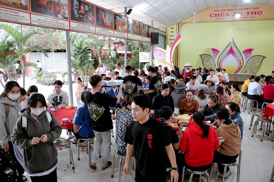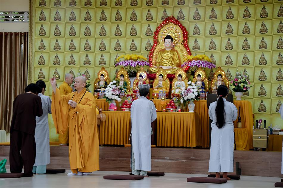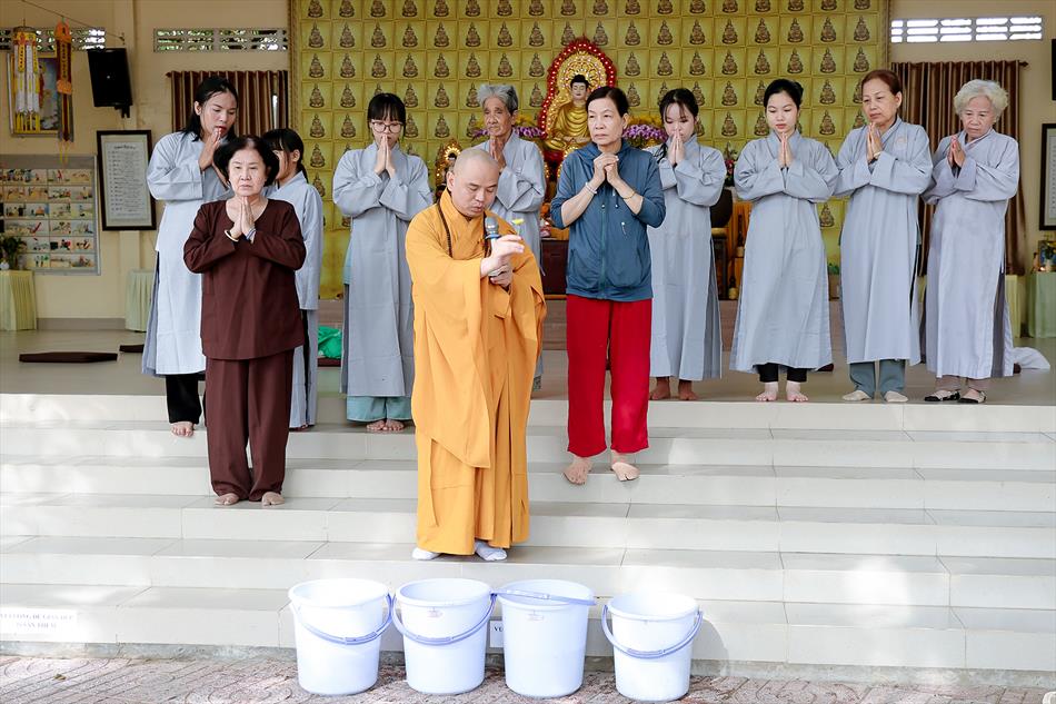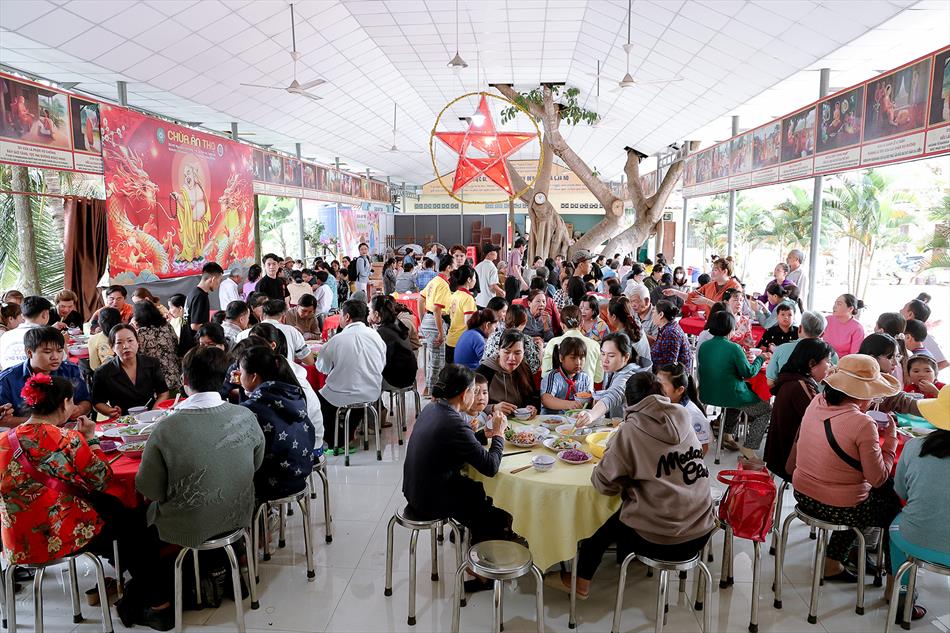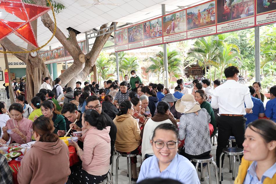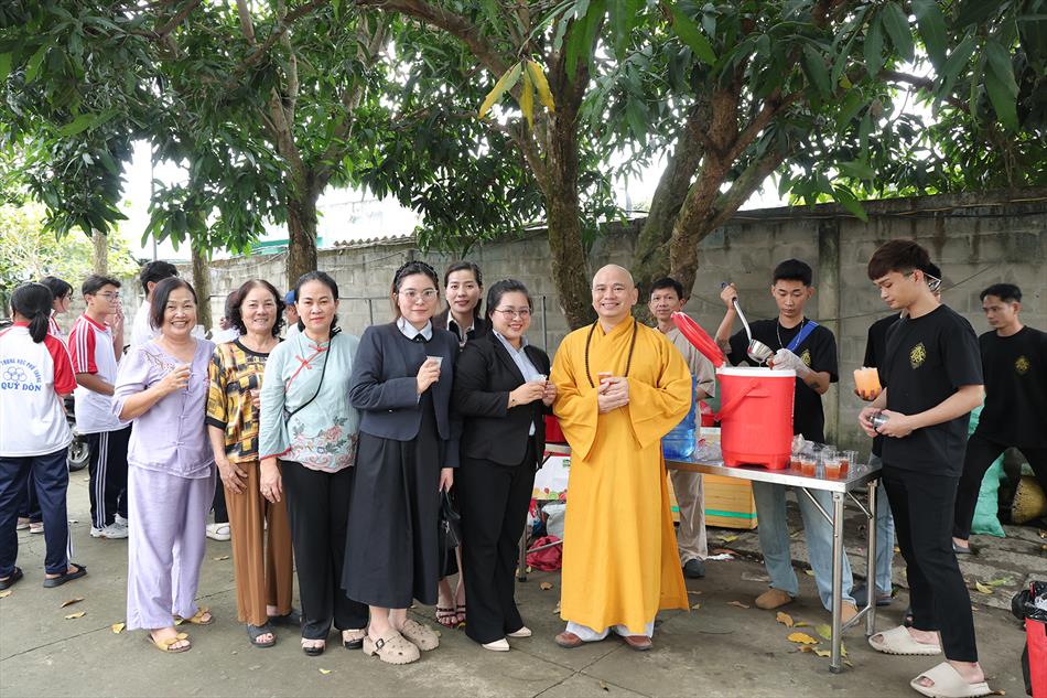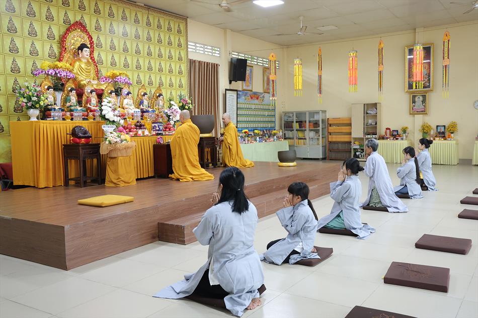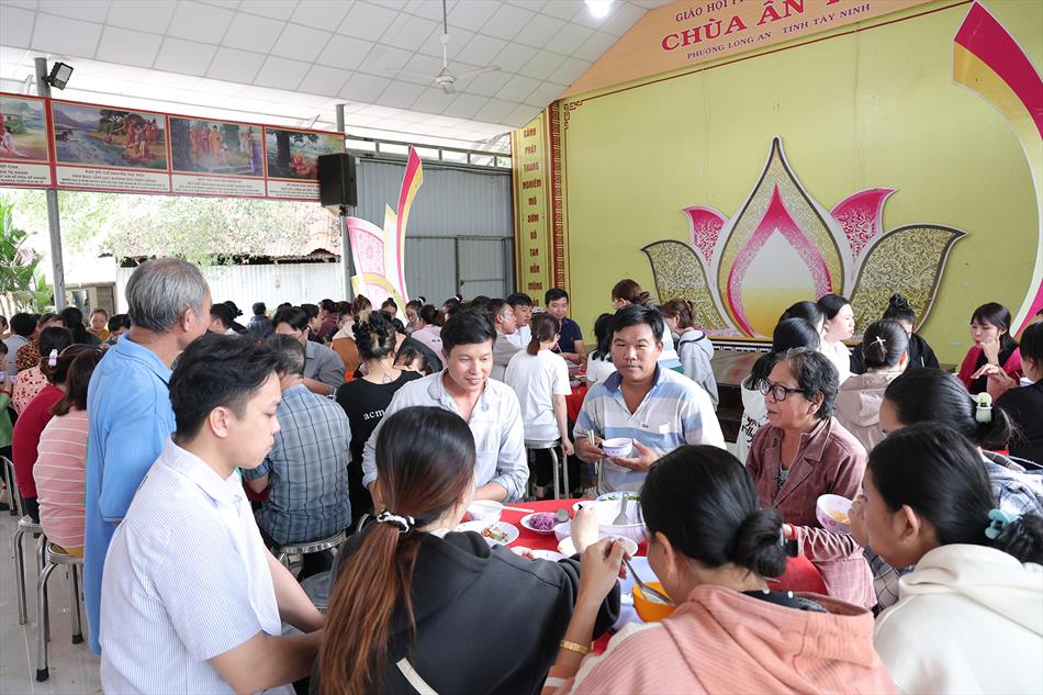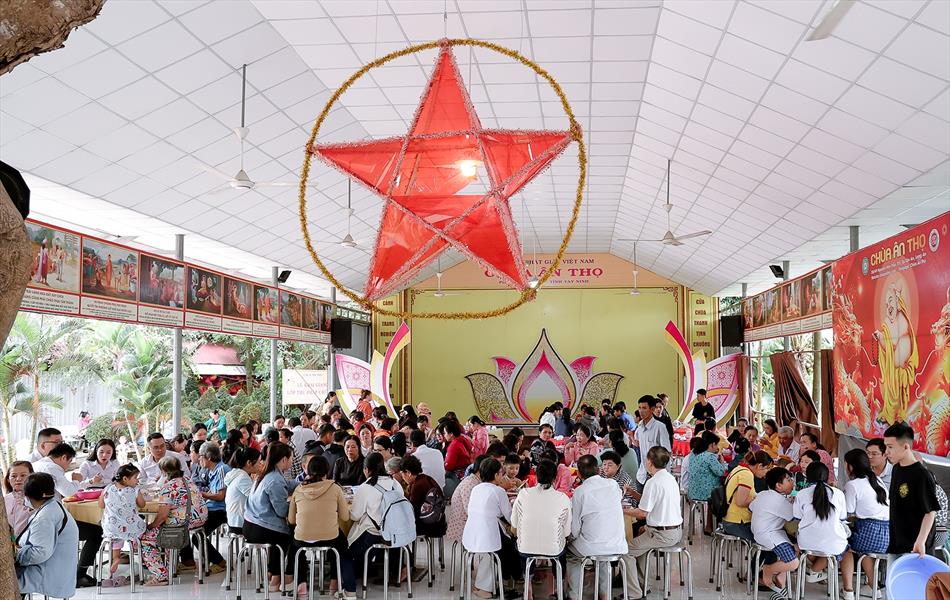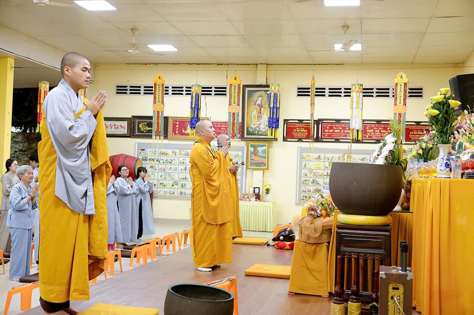 Sau lễ quy y và tụng kinh, chùa đón tiếp đông đảo Phật tử và khách thập phương đến dâng hương, lễ Phật. Như thường lệ vào các ngày rằm lớn, chùa chuẩn bị bữa cơm chay thân mật. Nhà bếp đã sắp xếp công việc liên tục suốt một tuần lễ, chuẩn bị các món chiên, xào, xỏ xiên…trữ đông để phục vụ hôm nay. Tổng cộng 150 mâm (mỗi mâm 10 người) được chiêu đãi trong buổi trưa. Lời khen của khách làm cho đại chúng quên đi mệt nhọc, xem đó như niềm vui cống hiến cho Tam Bảo và phục vụ khách thập phương.