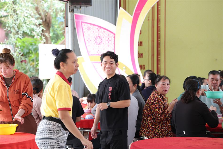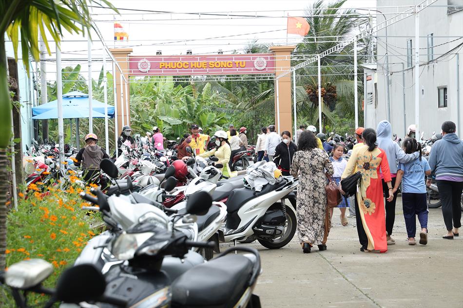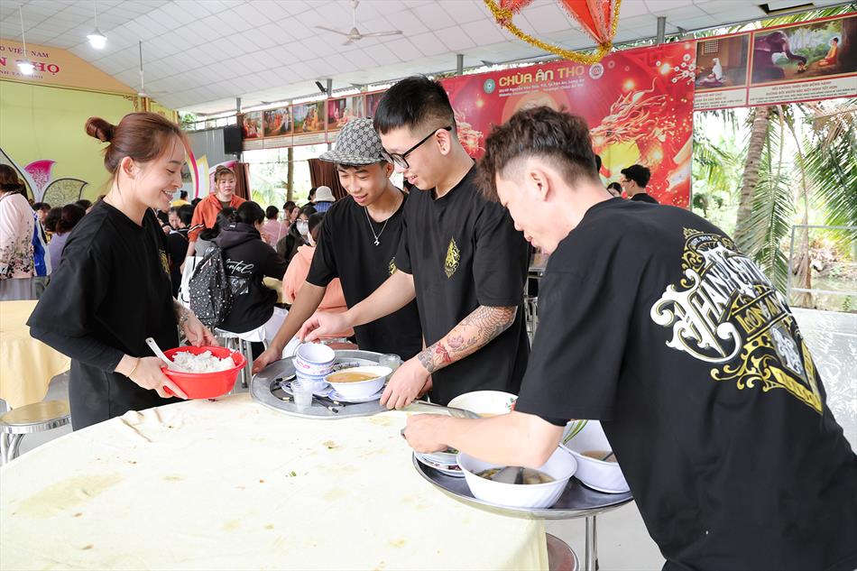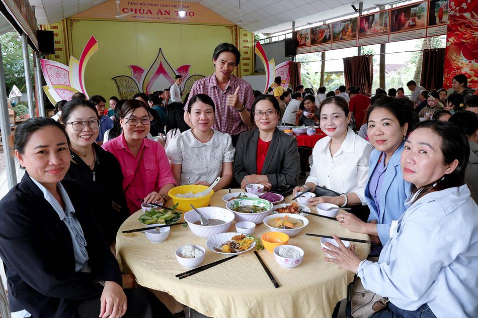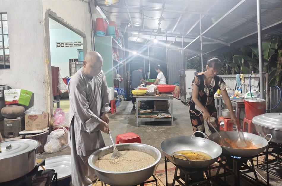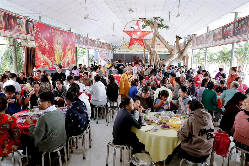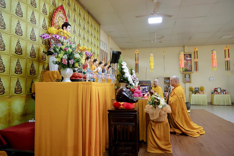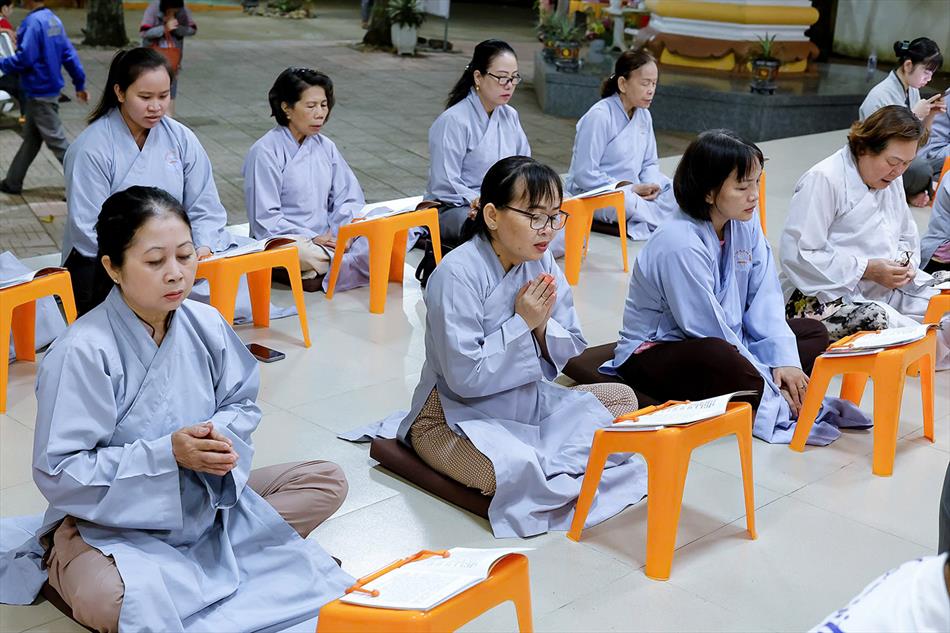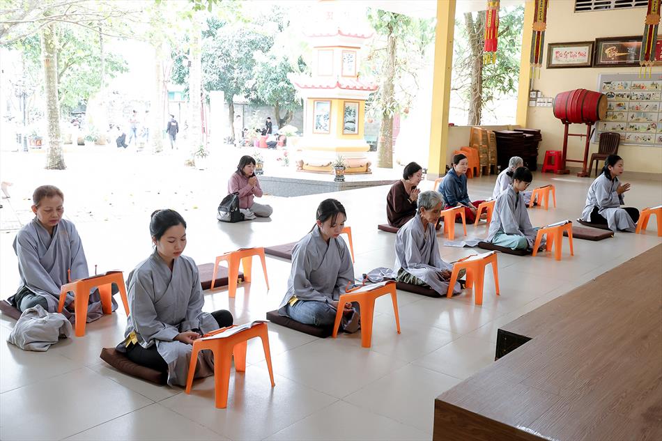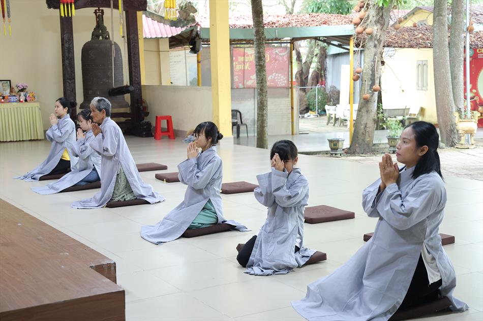 Sau lễ quy y và tụng kinh, chùa đón tiếp đông đảo Phật tử và khách thập phương đến dâng hương, lễ Phật. Như thường lệ vào các ngày rằm lớn, chùa chuẩn bị bữa cơm chay thân mật. Nhà bếp đã sắp xếp công việc liên tục suốt một tuần lễ, chuẩn bị các món chiên, xào, xỏ xiên…trữ đông để phục vụ hôm nay. Tổng cộng 150 mâm (mỗi mâm 10 người) được chiêu đãi trong buổi trưa. Lời khen của khách làm cho đại chúng quên đi mệt nhọc, xem đó như niềm vui cống hiến cho Tam Bảo và phục vụ khách thập phương.
