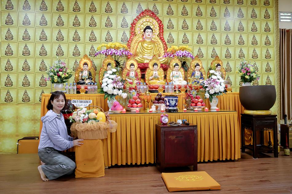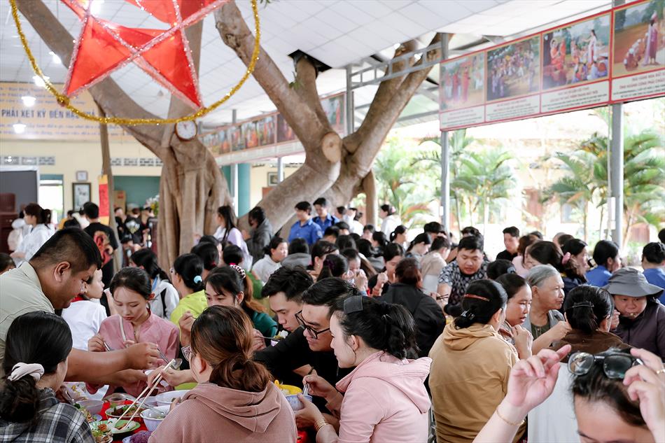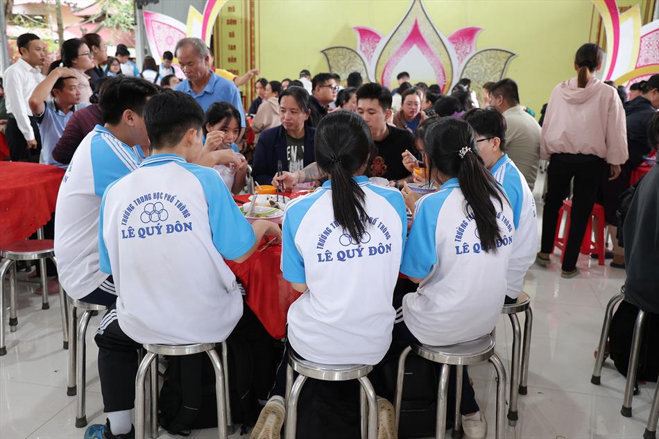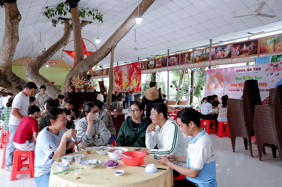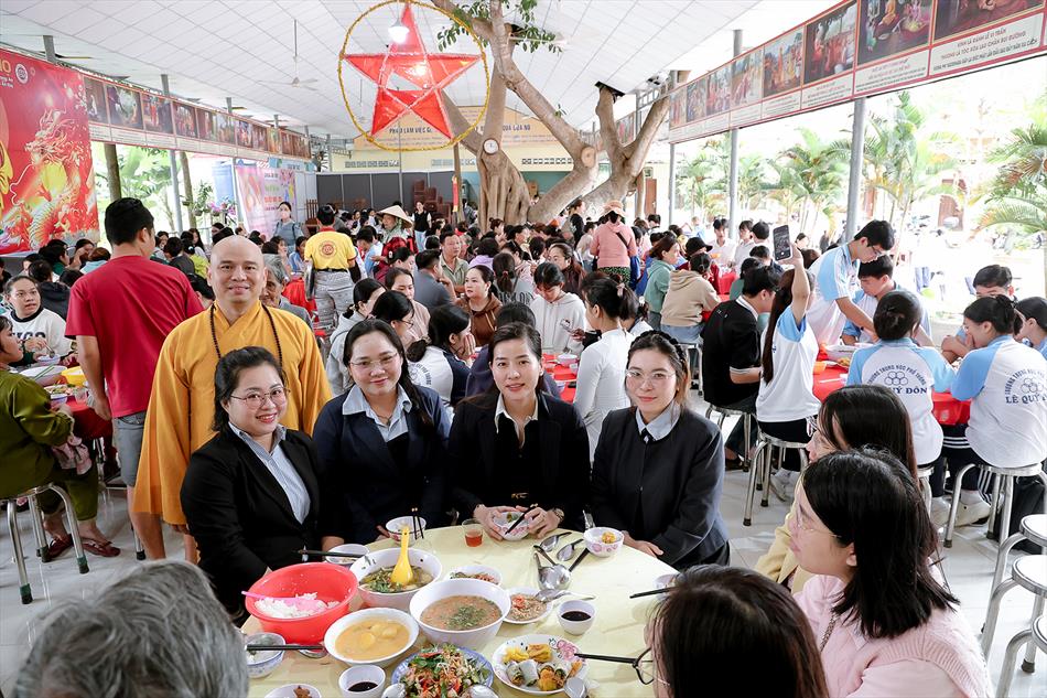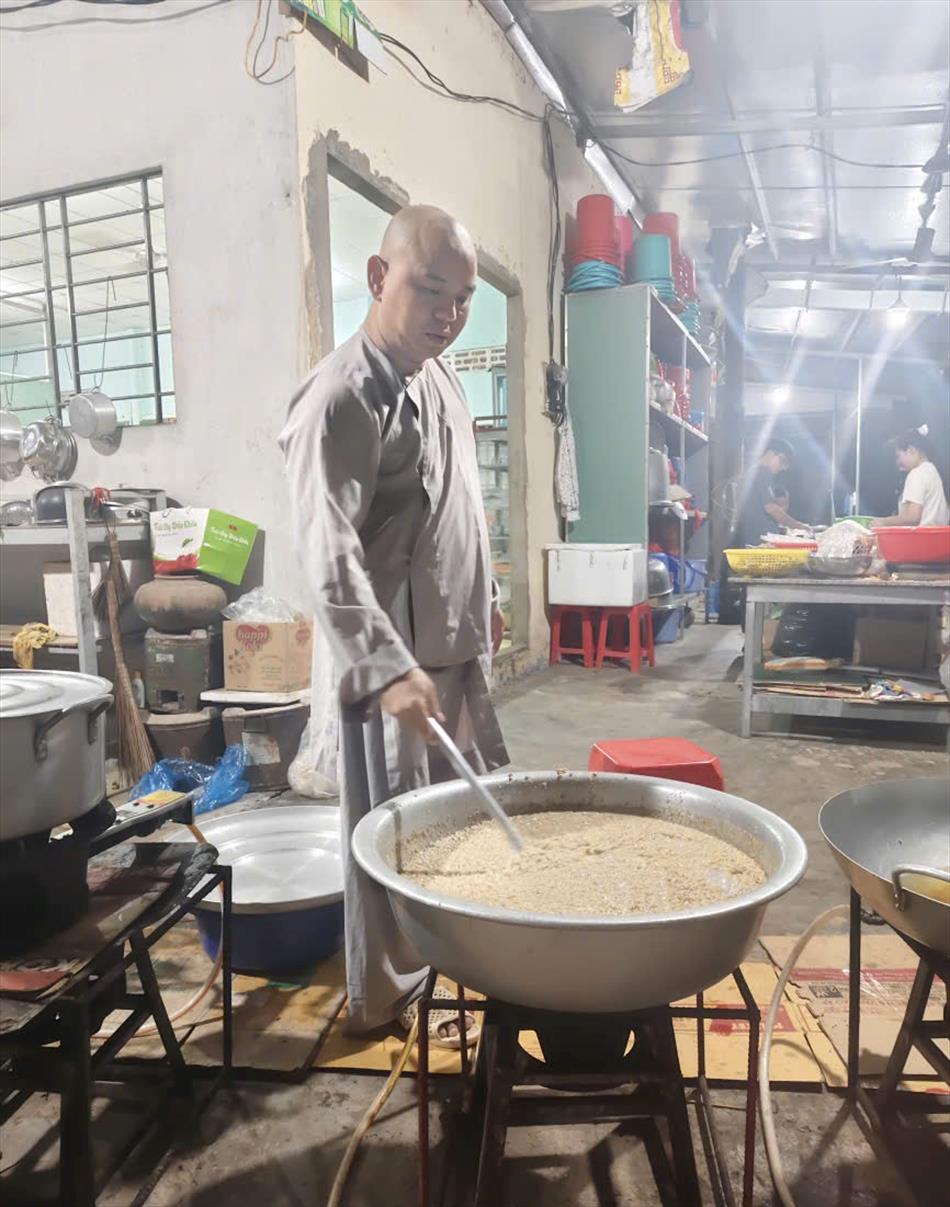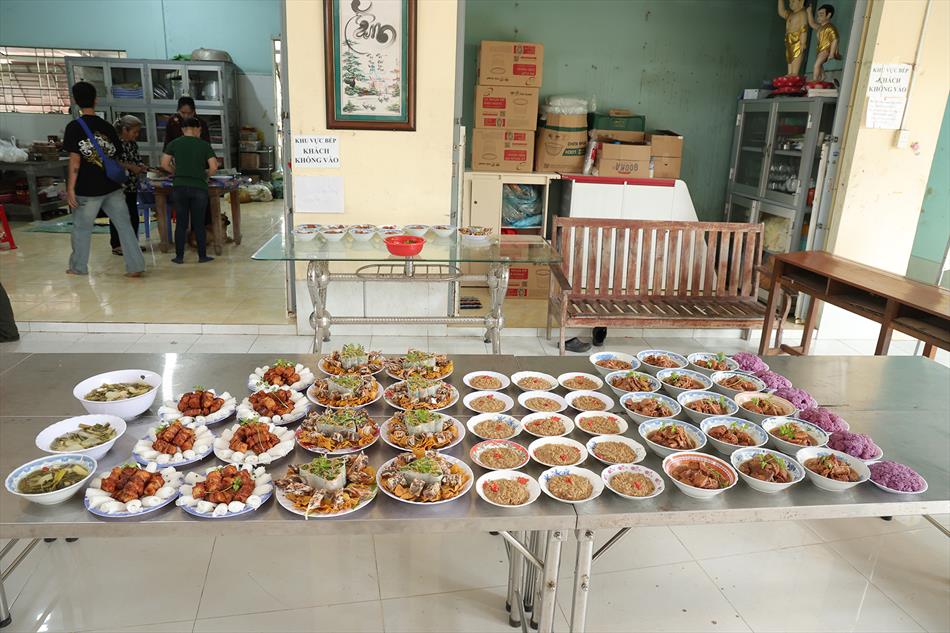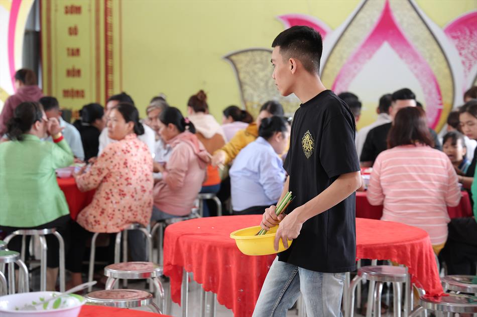 Sau lễ quy y và tụng kinh, chùa đón tiếp đông đảo Phật tử và khách thập phương đến dâng hương, lễ Phật. Như thường lệ vào các ngày rằm lớn, chùa chuẩn bị bữa cơm chay thân mật. Nhà bếp đã sắp xếp công việc liên tục suốt một tuần lễ, chuẩn bị các món chiên, xào, xỏ xiên…trữ đông để phục vụ hôm nay. Tổng cộng 150 mâm (mỗi mâm 10 người) được chiêu đãi trong buổi trưa. Lời khen của khách làm cho đại chúng quên đi mệt nhọc, xem đó như niềm vui cống hiến cho Tam Bảo và phục vụ khách thập phương.
