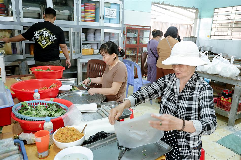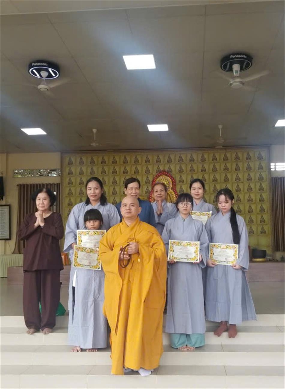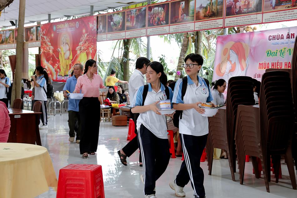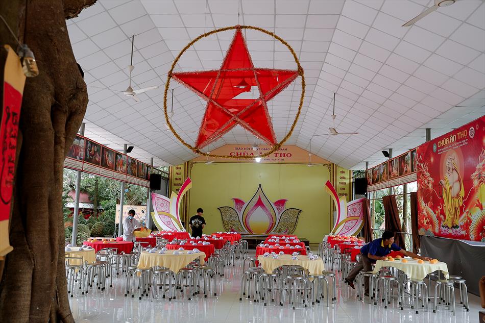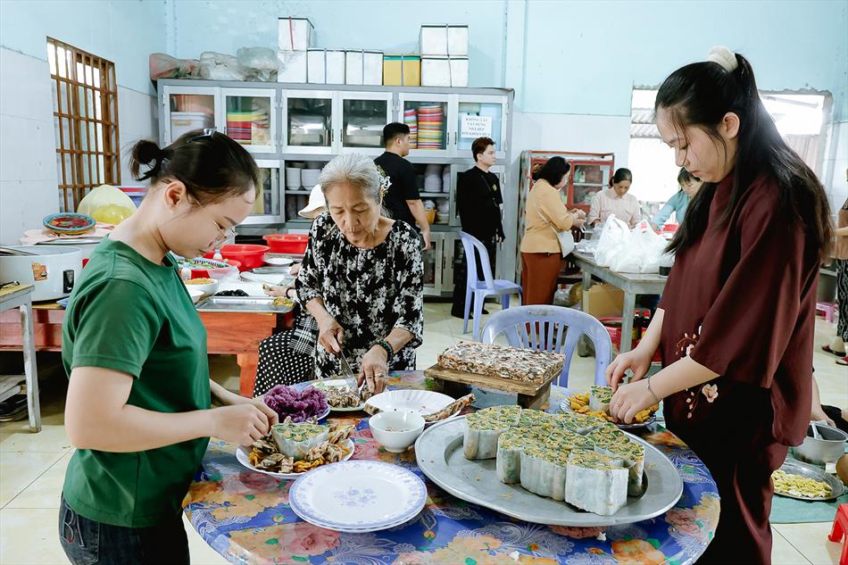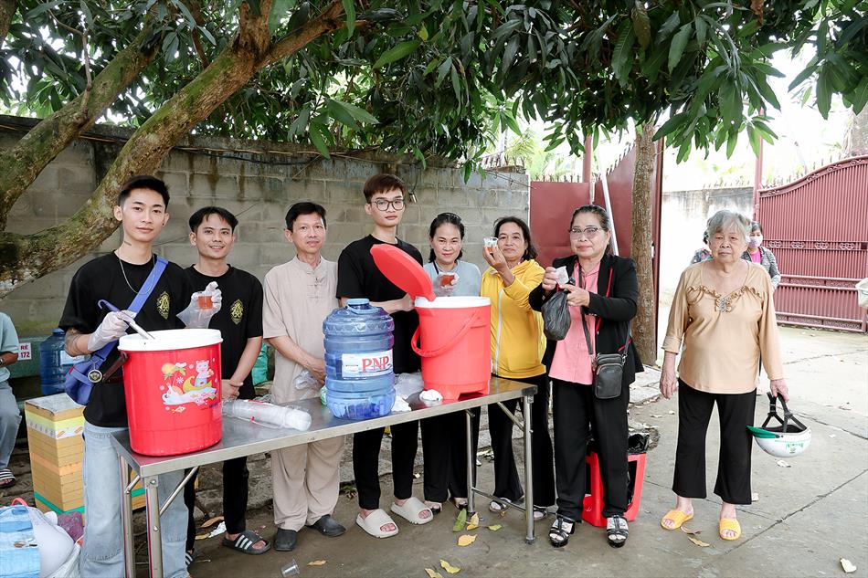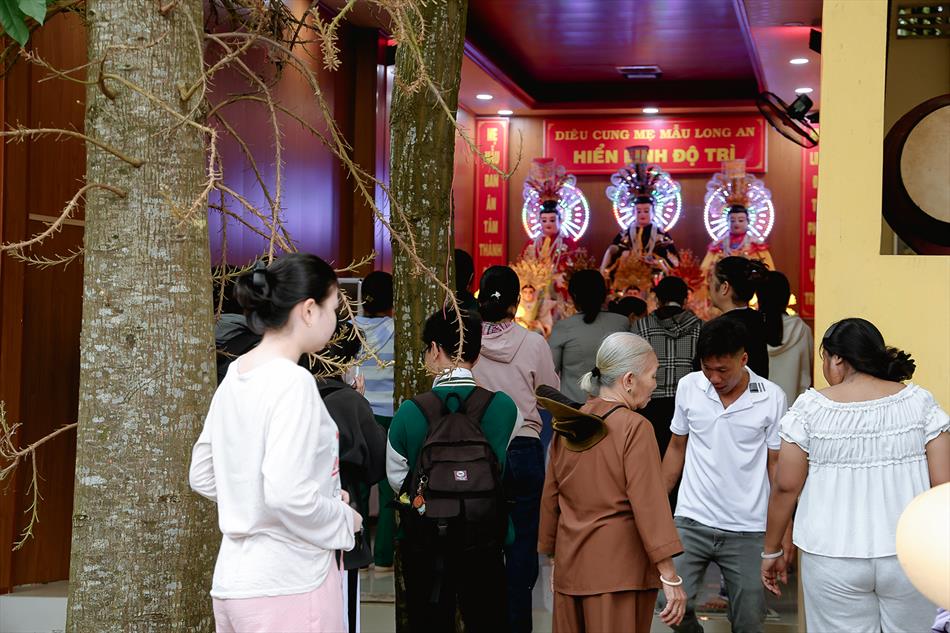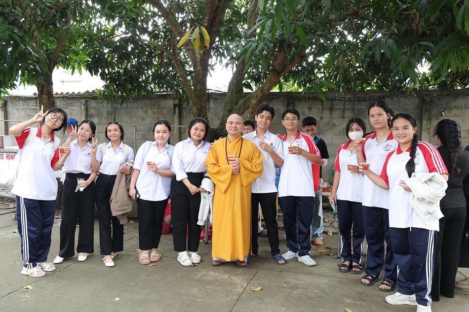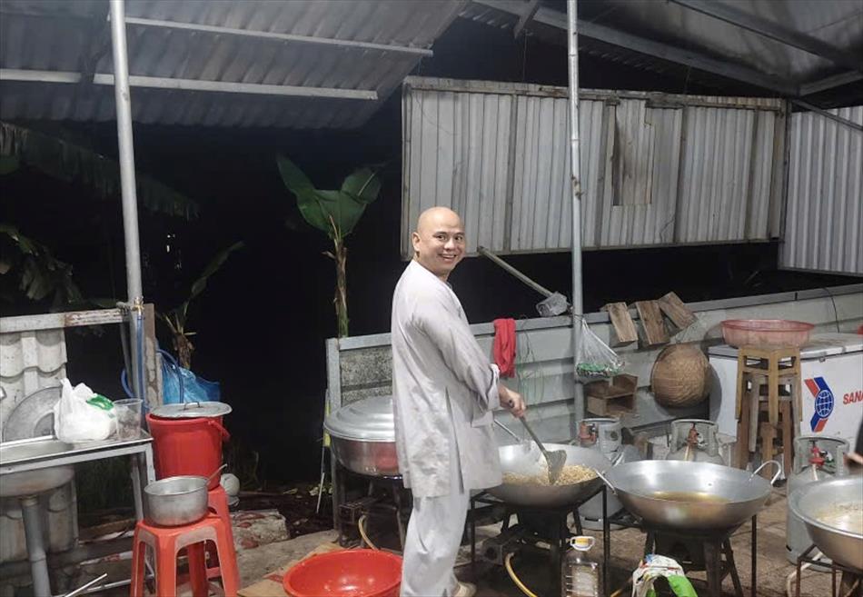 Sau lễ quy y và tụng kinh, chùa đón tiếp đông đảo Phật tử và khách thập phương đến dâng hương, lễ Phật. Như thường lệ vào các ngày rằm lớn, chùa chuẩn bị bữa cơm chay thân mật. Nhà bếp đã sắp xếp công việc liên tục suốt một tuần lễ, chuẩn bị các món chiên, xào, xỏ xiên…trữ đông để phục vụ hôm nay. Tổng cộng 150 mâm (mỗi mâm 10 người) được chiêu đãi trong buổi trưa. Lời khen của khách làm cho đại chúng quên đi mệt nhọc, xem đó như niềm vui cống hiến cho Tam Bảo và phục vụ khách thập phương.
