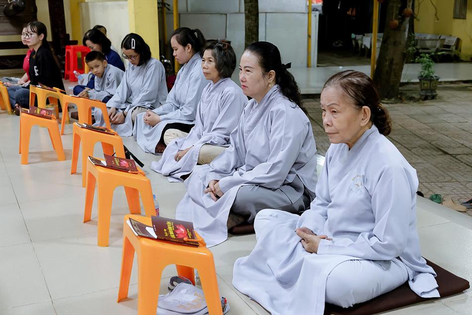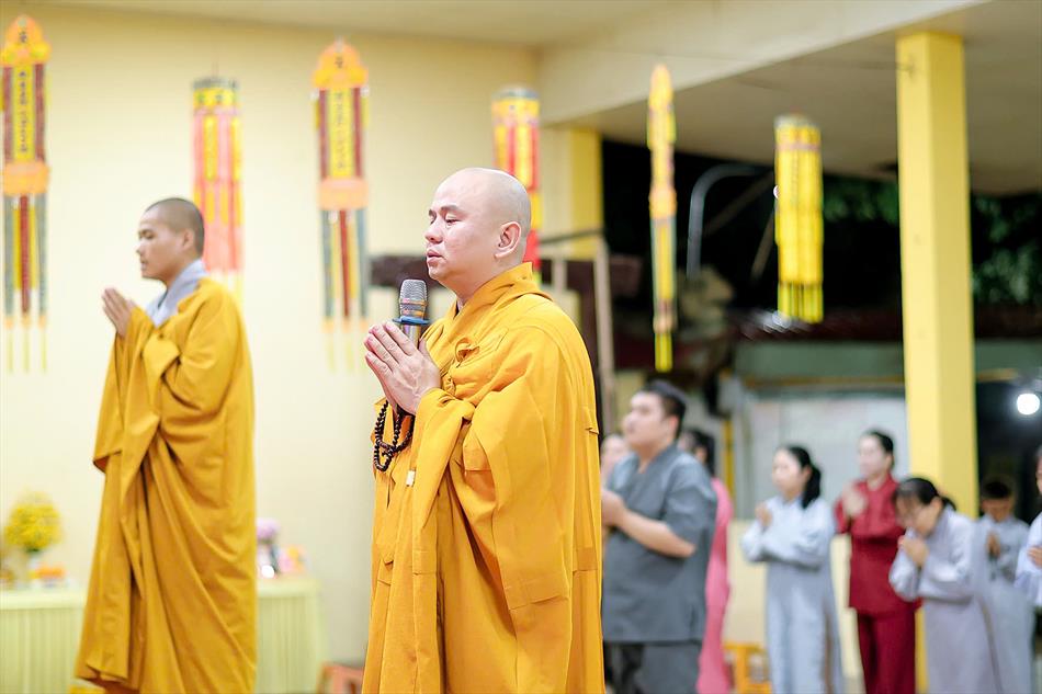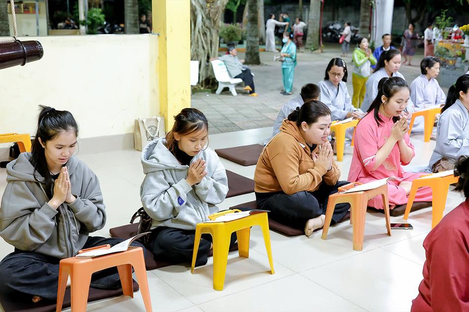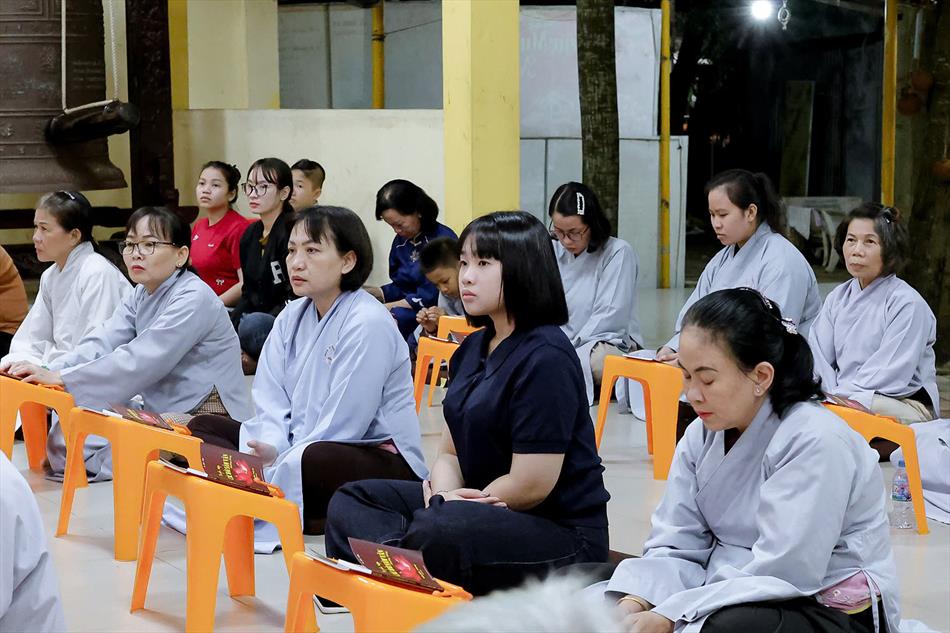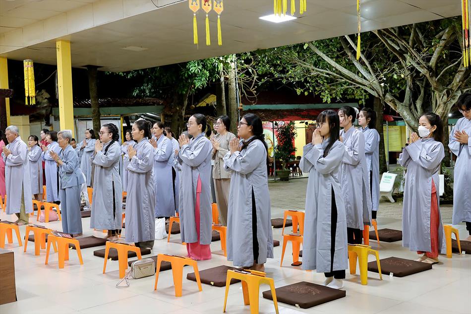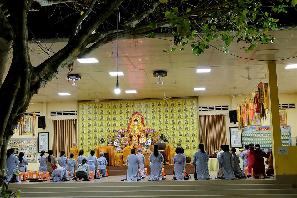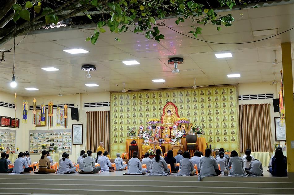 Buổi chiều tối, đại chúng tiếp tục tham dự khóa lễ sám hối, tụng kinh, và sau đó là thời thuyết pháp - chương trình sinh hoạt cố định trong các rằm lớn của chùa. Riêng 3 rằm trọng đại (tháng Giêng, tháng Tư và tháng Bảy), chùa tổ chức thêm văn nghệ, hoa đăng, tiệc bánh. Rằm tháng Mười, chương trình chỉ thuần lễ nghi và thuyết pháp, không có văn nghệ.