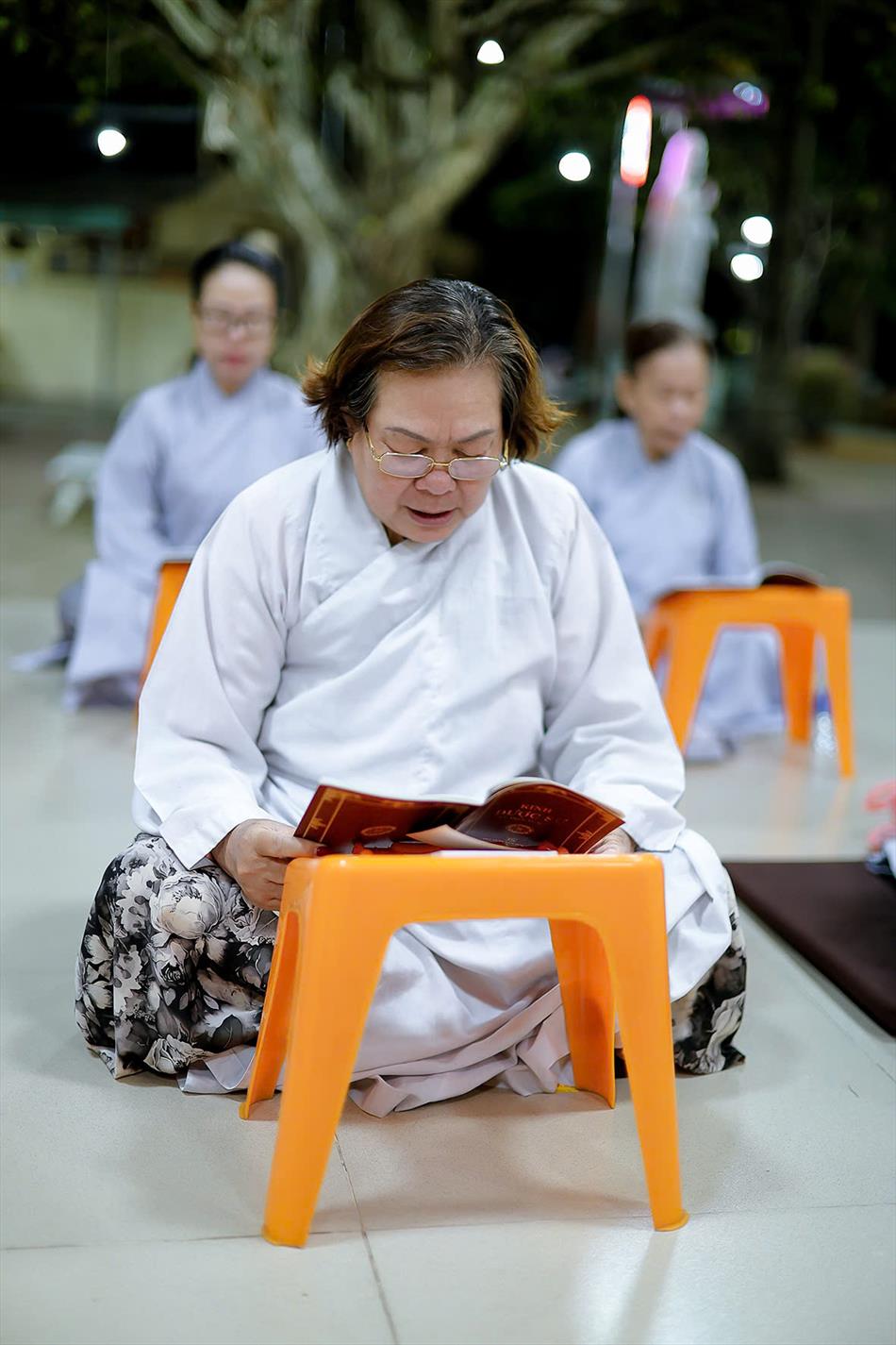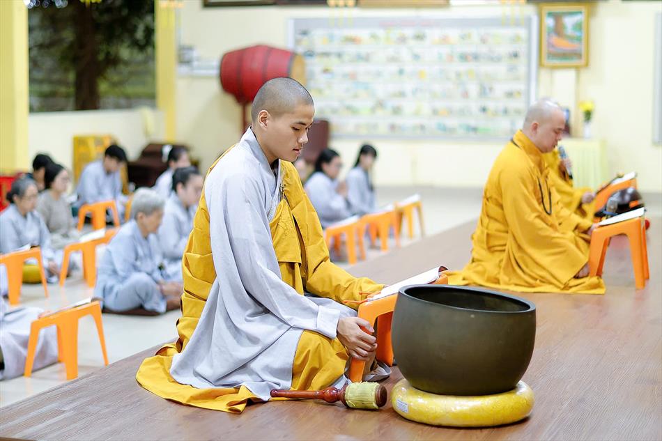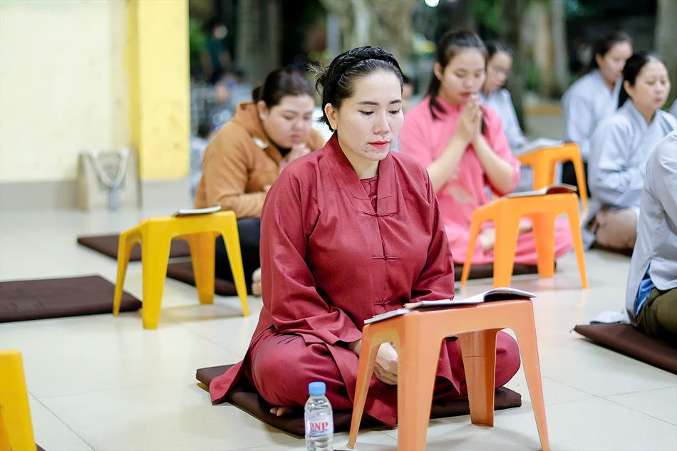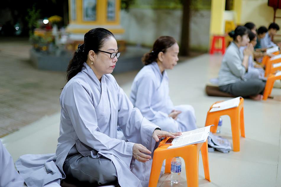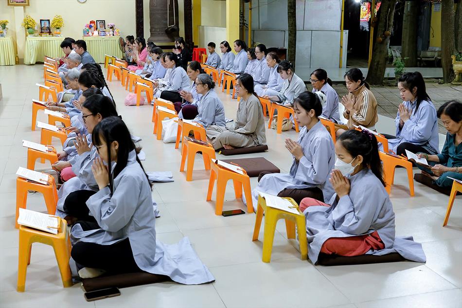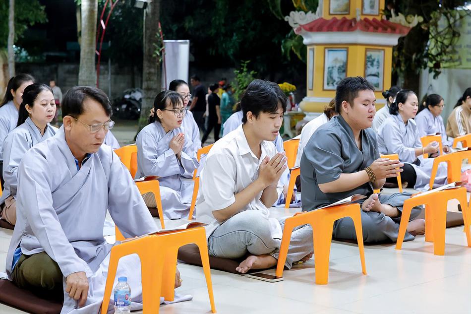 Buổi chiều tối, đại chúng tiếp tục tham dự khóa lễ sám hối, tụng kinh, và sau đó là thời thuyết pháp - chương trình sinh hoạt cố định trong các rằm lớn của chùa. Riêng 3 rằm trọng đại (tháng Giêng, tháng Tư và tháng Bảy), chùa tổ chức thêm văn nghệ, hoa đăng, tiệc bánh. Rằm tháng Mười, chương trình chỉ thuần lễ nghi và thuyết pháp, không có văn nghệ.