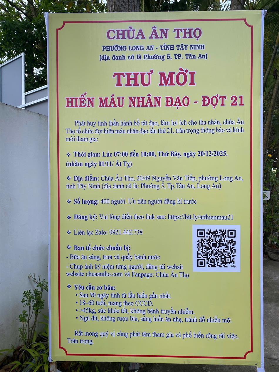 Chương trình kế tiếp của chùa là đợt hiến máu nhân đạo lần thứ 21, phối hợp cùng Ban Trị sự GHPGVN tỉnh Tây Ninh, dự kiến thu hút khoảng 400 người tham gia.