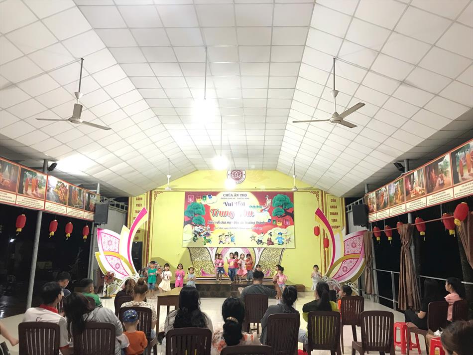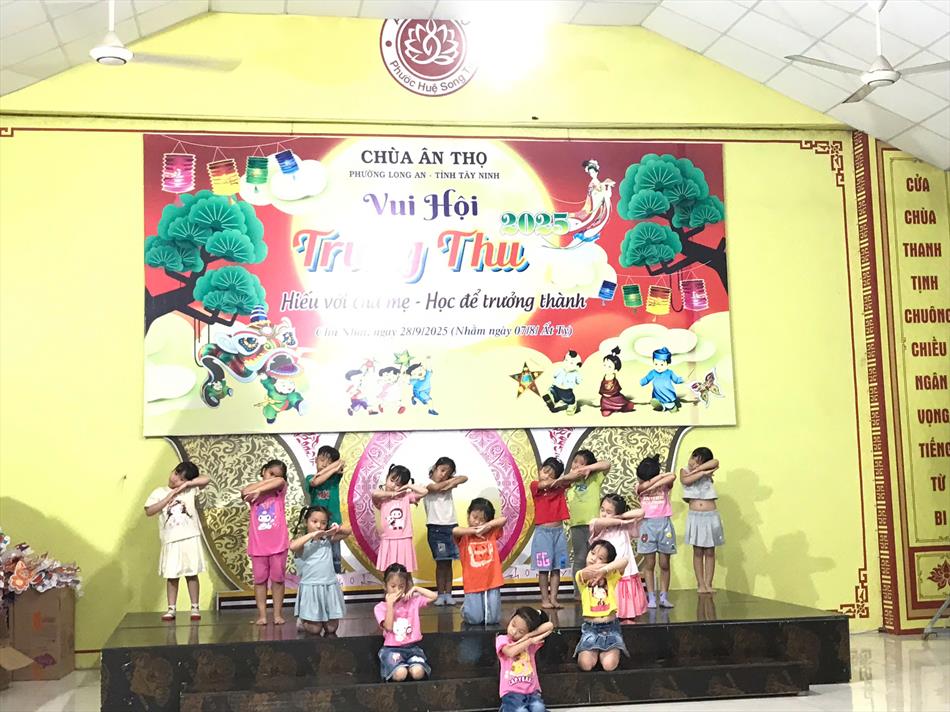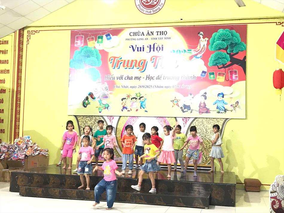 Chiều ngày 28/9/2025 (nhằm mùng 7/8 ÂL), chùa Ân Thọ (phường Long An, tỉnh Tây Ninh) đã trang trọng tổ chức Vui hội Trung Thu với chủ đề “Trung thu Thiền Môn: Hiếu với cha mẹ, học để trưởng thành”. Hàng trăm em nhỏ cùng phụ huynh nô nức tham dự, hòa mình vào không khí rộn ràng, ấm áp với nhiều hoạt động văn nghệ, trò chơi và ẩm thực.